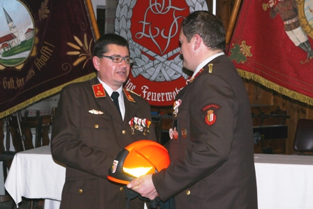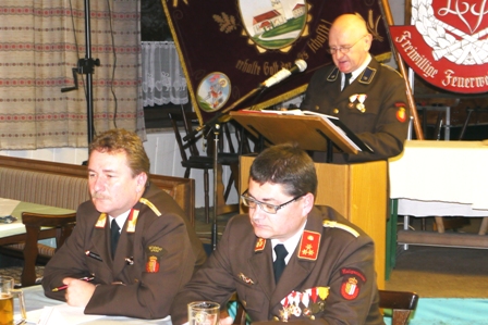 Hans Schwankner gratuliert dem neuen Kommandanten Erich Stöllberger, wünscht viel Erfolg bei der Ausübung des neuen Amtes und übergibt die Leitung der Versammlung.