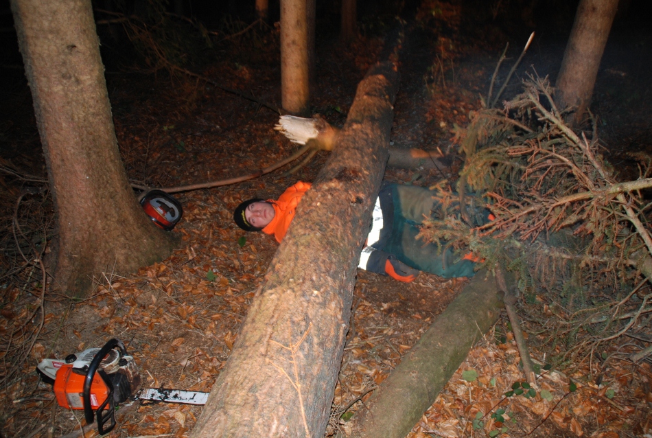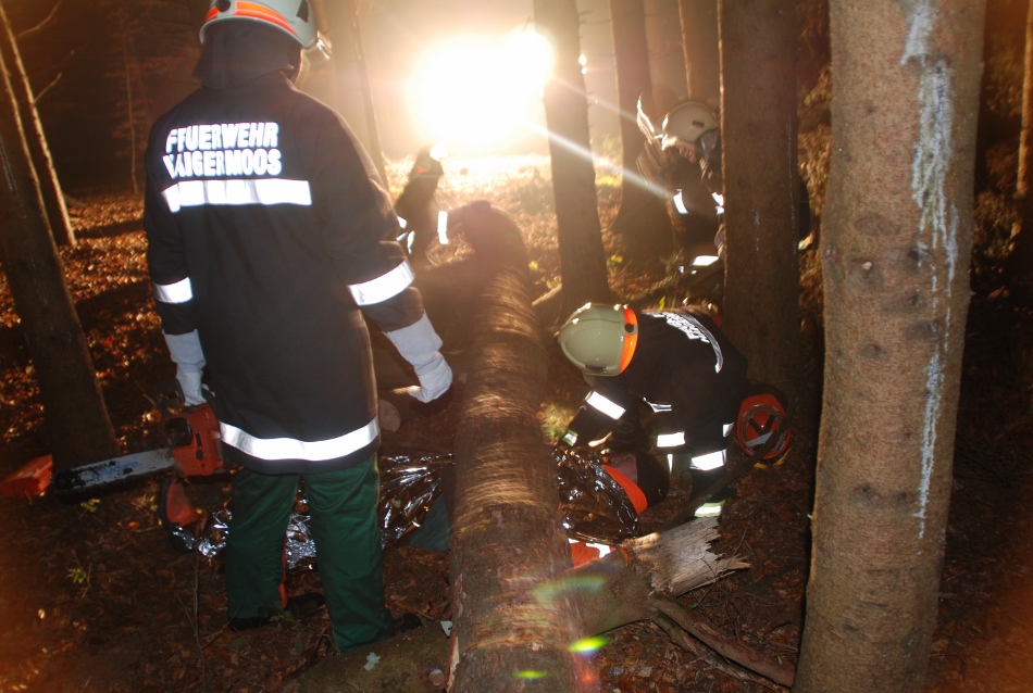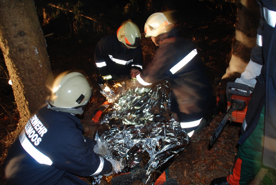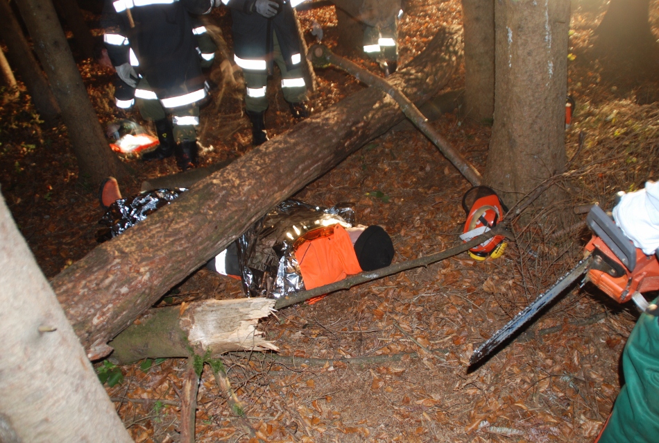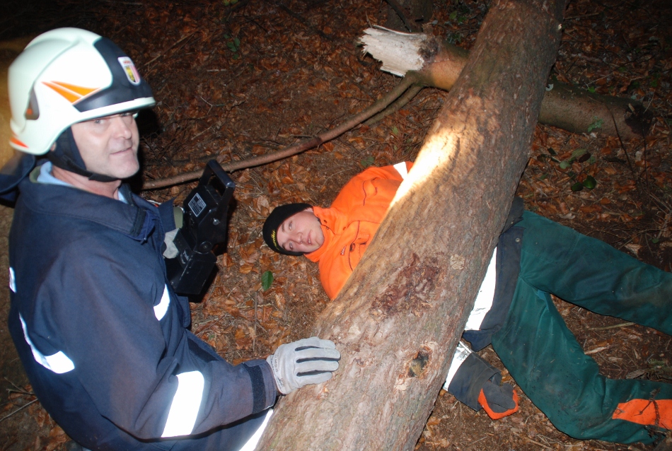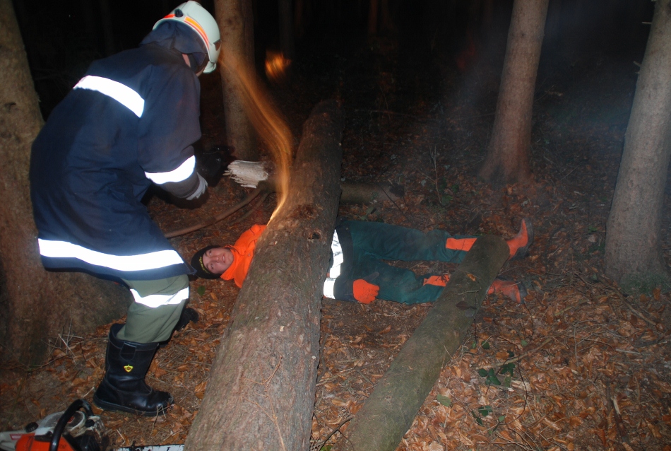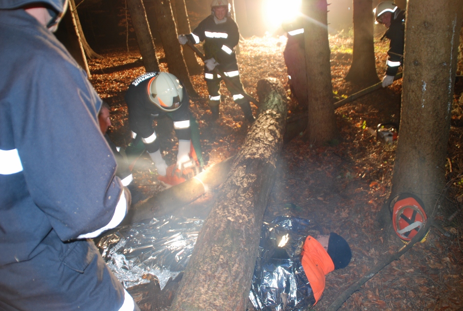 Übungsverlauf: Ein junger Mann, Sohn eines bäuerlichen Anwesens hat am späteren Nachmittag noch im Wald zu arbeiten. Als er bei der einbrechenden Dunkelheit nicht nach Hause kommt, sieht die Bäuerin nach dem Rechten und muss feststellen, dass ihr Sohn unter einem größeren Baum , den er gefällt hatte, liegend eingeklemmt ist. Die Mutter alarmiert sofort die Einsatzkräfte, die den jungen Mann ohne größere technische Hilfsmittel aus seiner Lage befreien müssen.