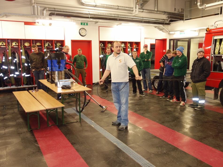 Die Ausrüstung wurde mit einem Wassersauger zur professionellen Reinigung überfluteter Kellerräume ergänzt. Der neue Gerätewart AW Bernhard Gläser erklärt die Funktionsweise und den Gebrauch des Gerätes.