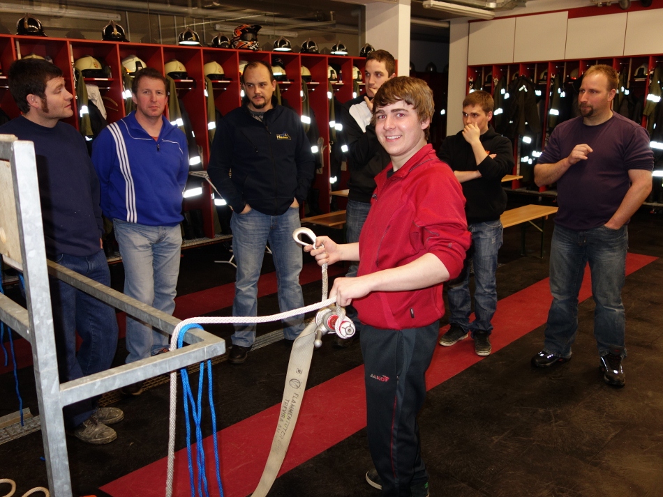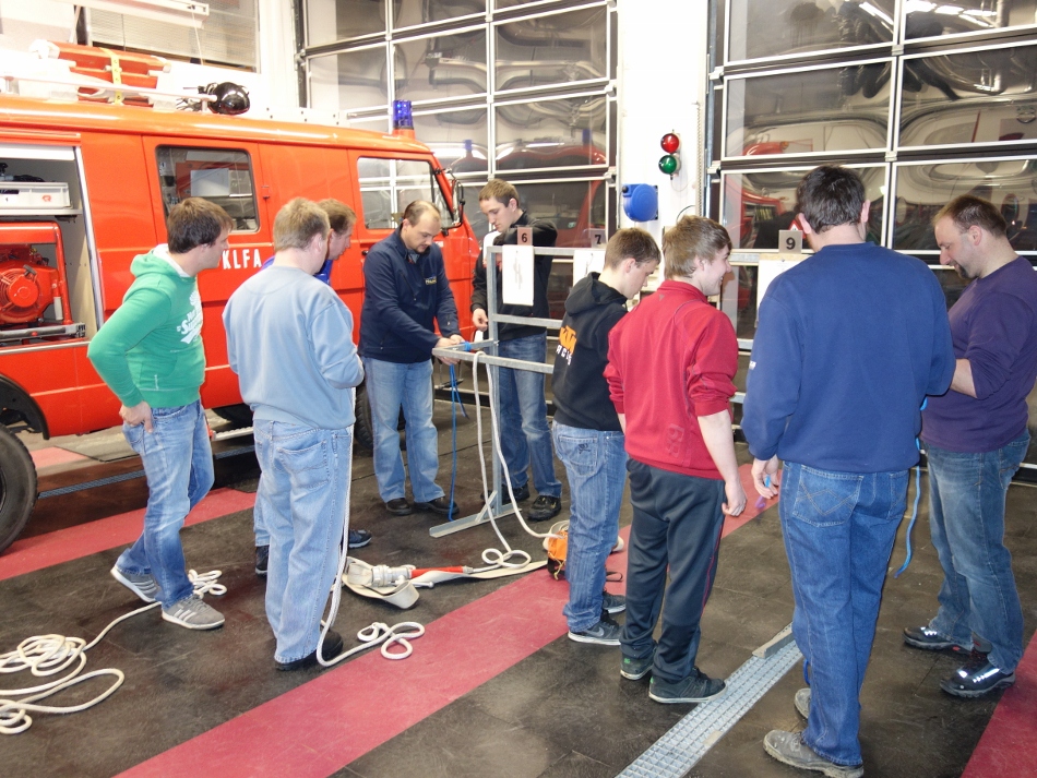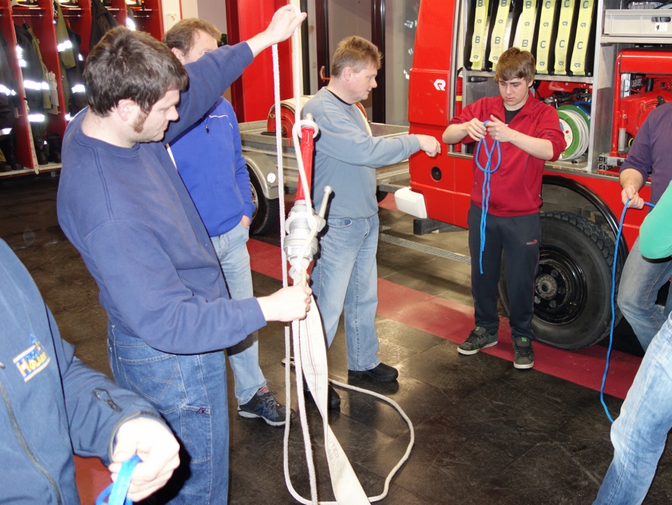 Es wurden verschiedene Knoten und Stiche zum Sichern, Herablassen und Befestigen von Gegenständen (Einsatzmaterialien) geübt.