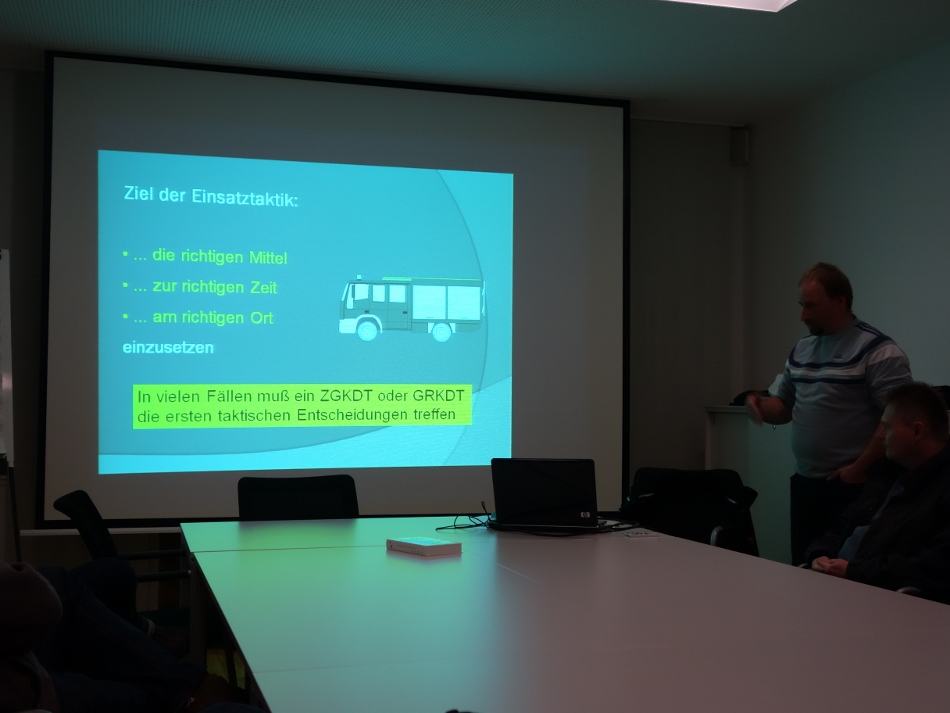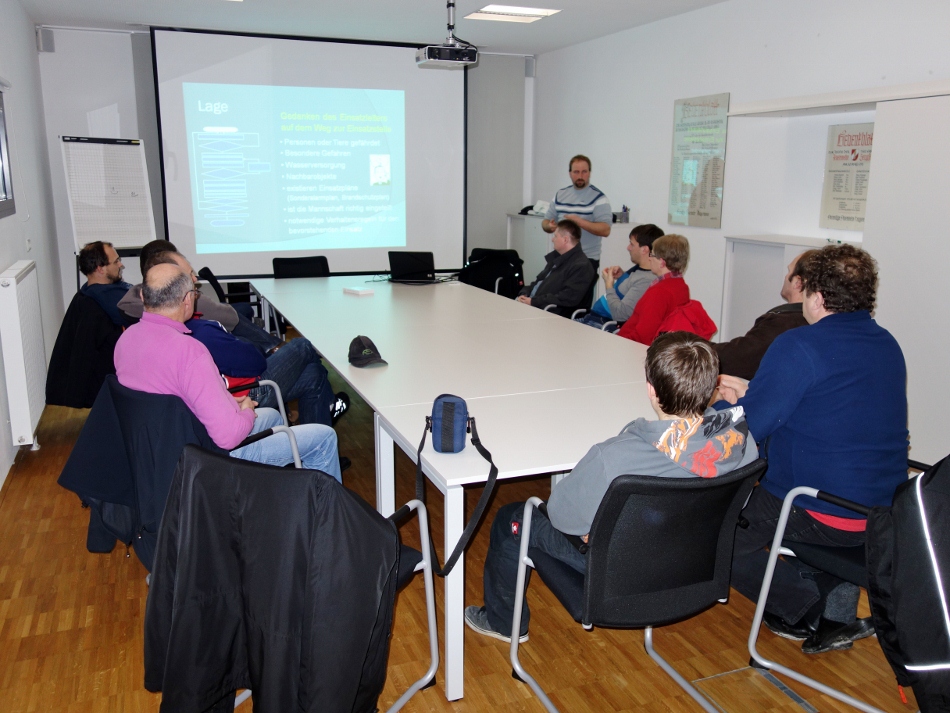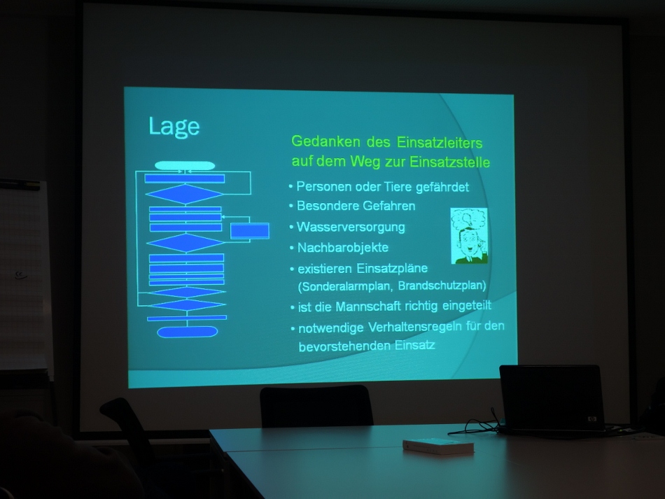 Am 11.2.2014 erklärt Ausbildungsleiter OBI Matthäus Schmidlechner im Vortragsraum des Feuerwehrhauses anhand einer Präsentation detailliert den Regelkreis eines Einsatzes (Lagefeststellung, Planung, Befehlsgebung), sowie die Reihenfolge der Maßnahmen bei und nach dem Einsatz.