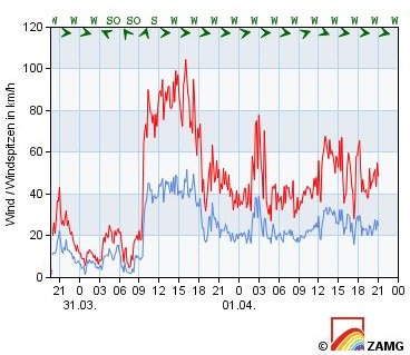 Es wurden in der Wetterwarte Ostermiething Windspitzen bis zu 105 km/h gemessen (Siehe Grafik der ZAMG).