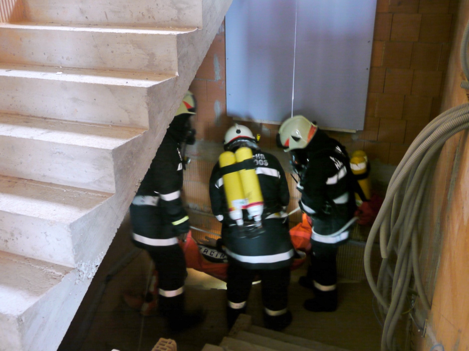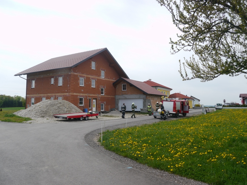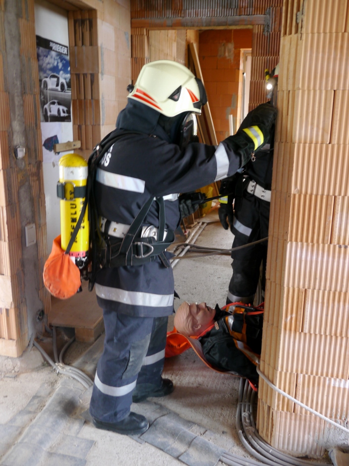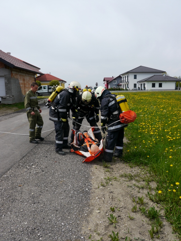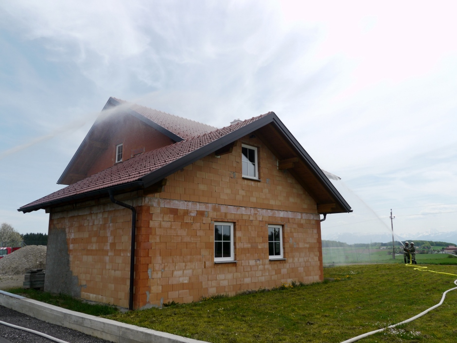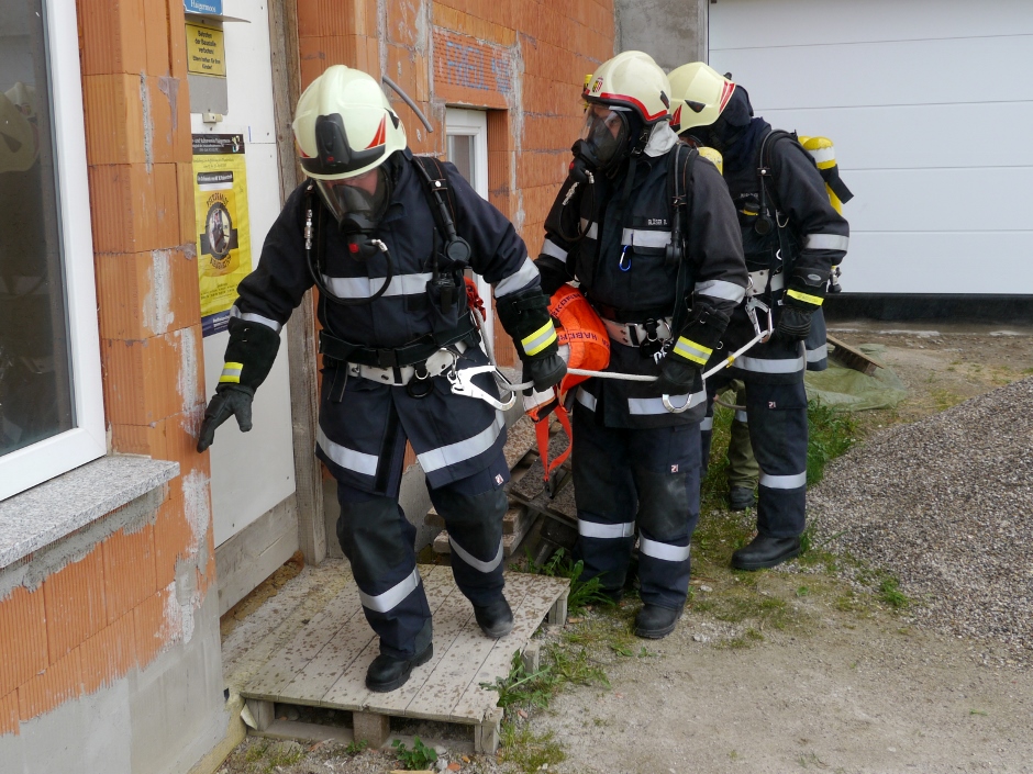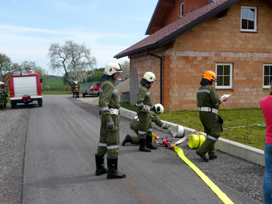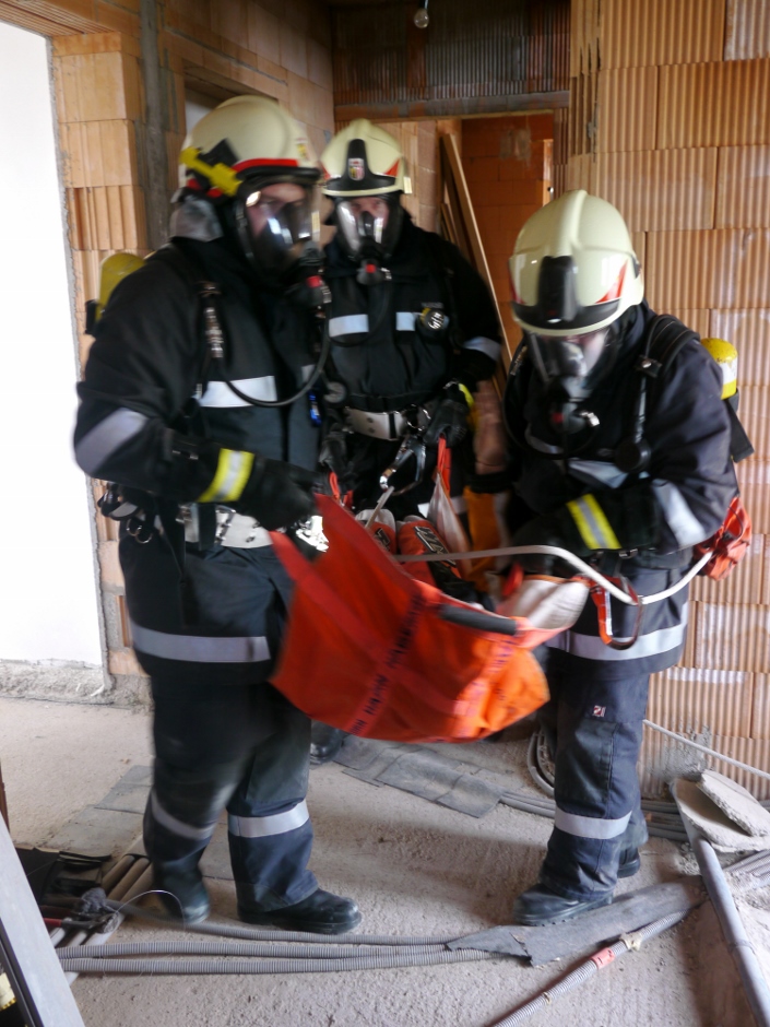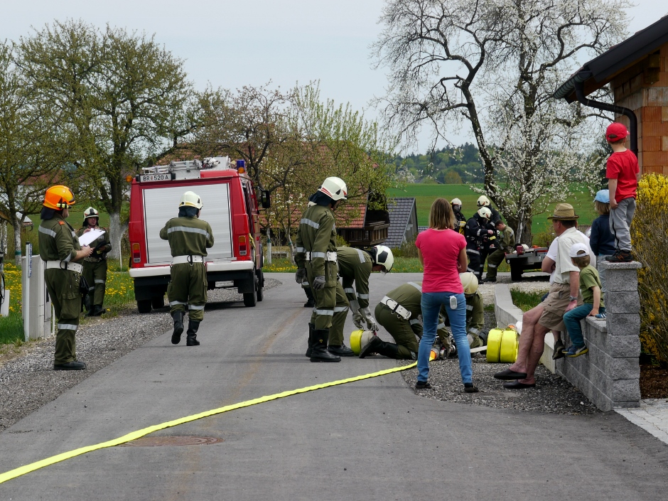Die Übungsannahme war ein Brand eines Einfamilienhauses. Eine bewusstlose Person musste gerettet werden. Nach Aufbau der Zubringerleitung erfolgte der Löschangriff mit 2 Strahlrohren. Der Atemschutztrupp nahm die Personenrettung im verrauchten Kellergeschoß vor.