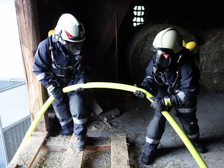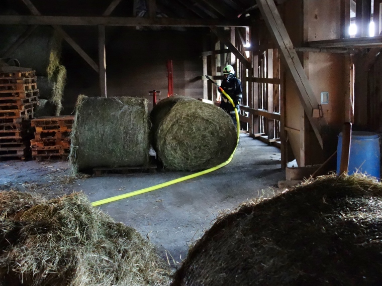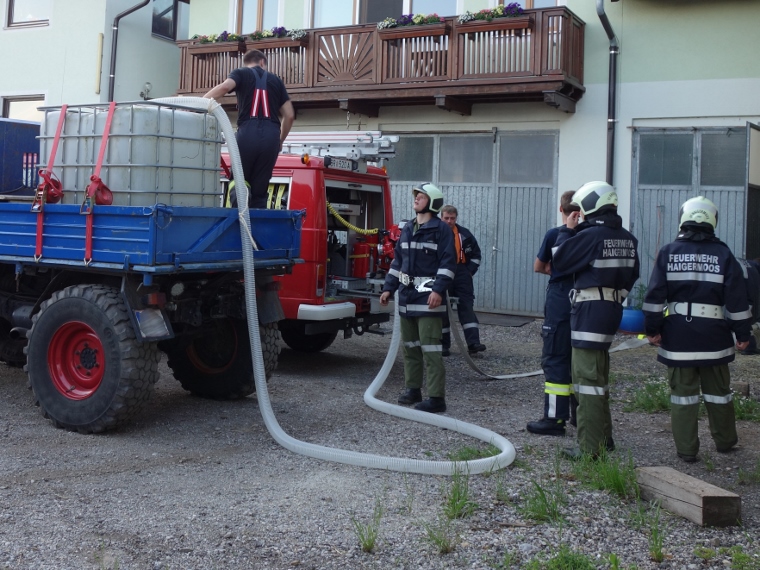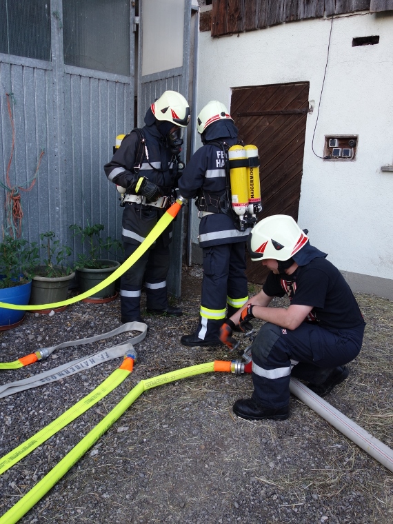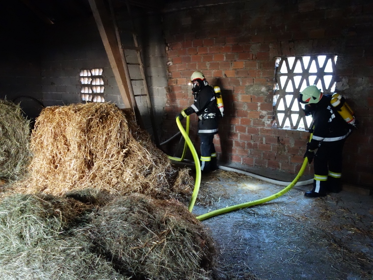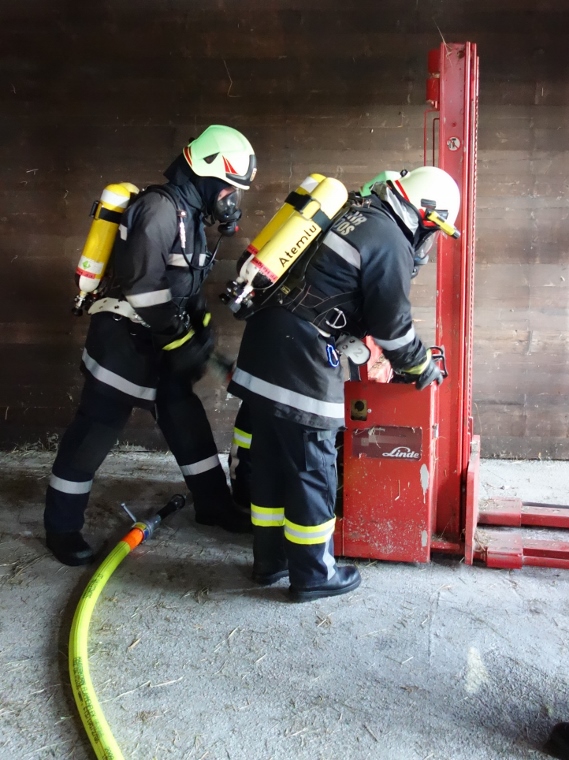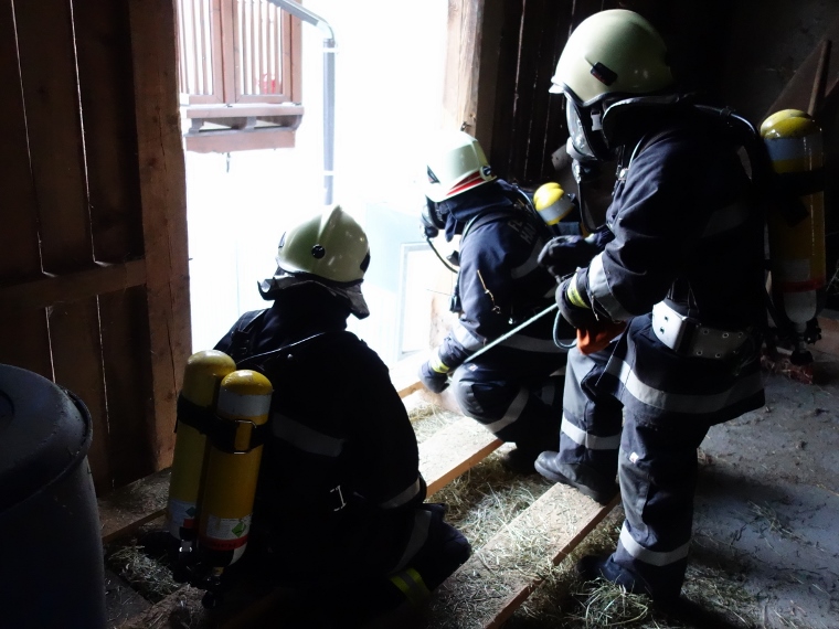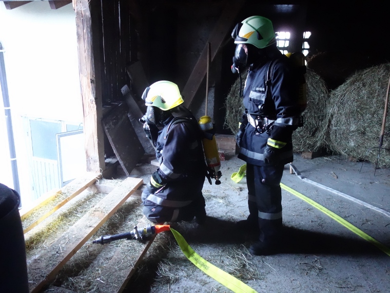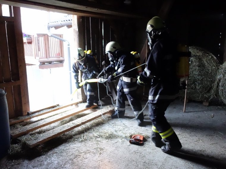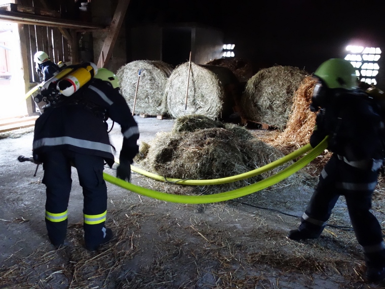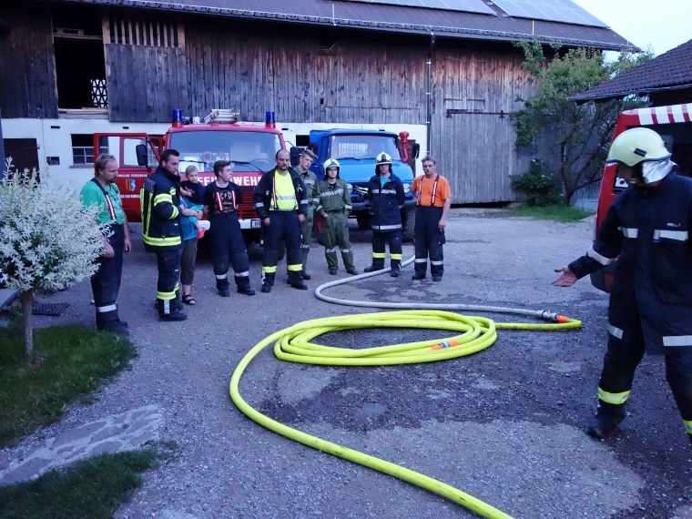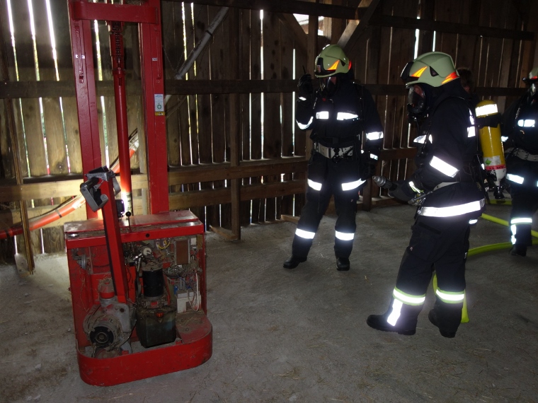 Angenommen wurde ein Löschangriff auf eine brennende Arbeitsmaschine am Heuboden. Da keine Wasserentnahmestelle zur Verfügung stand, wurde kurzfristig mit einem 1000 Liter Wassertank auf einem Privatfahrzeug die Wasserversorgung hergestellt.