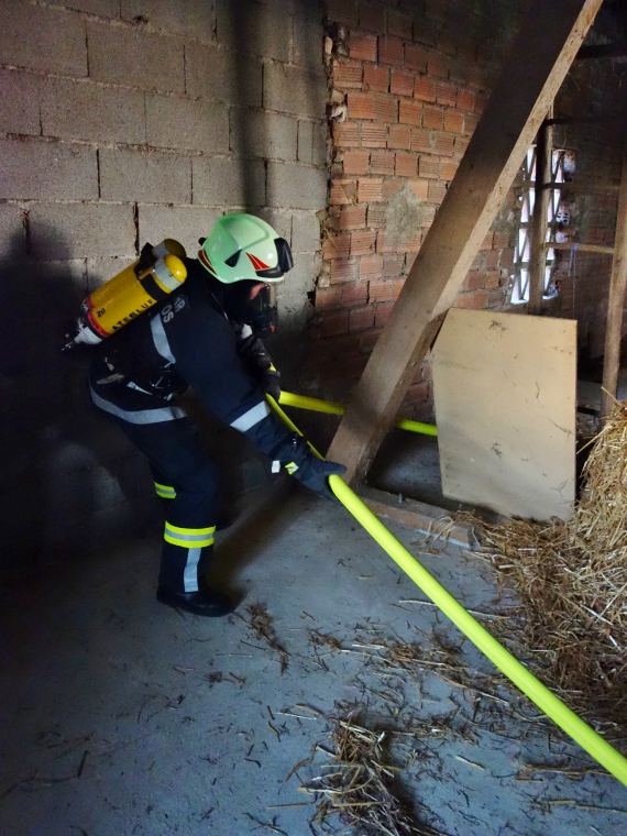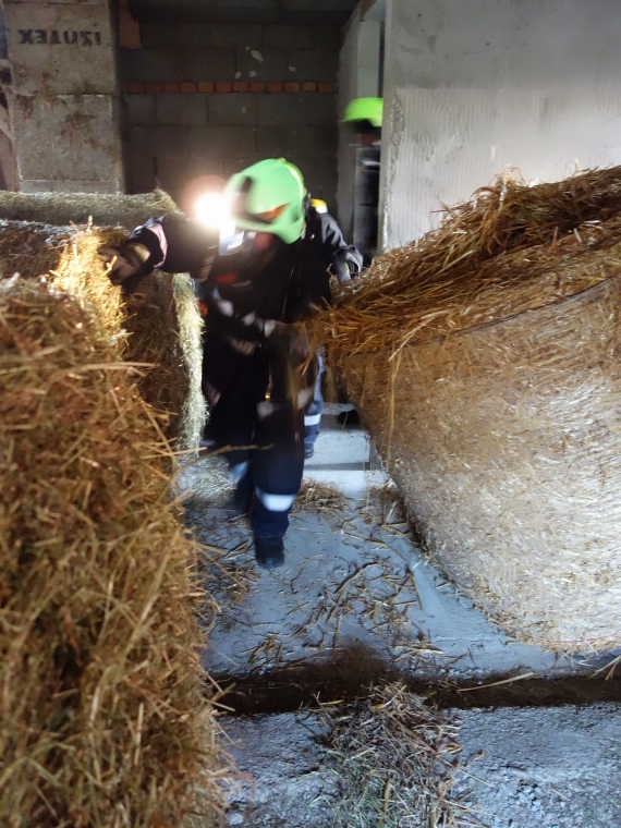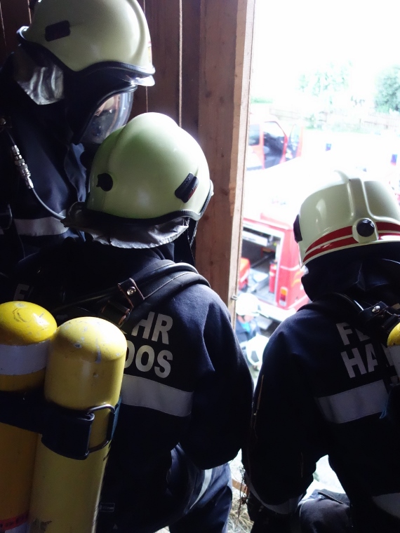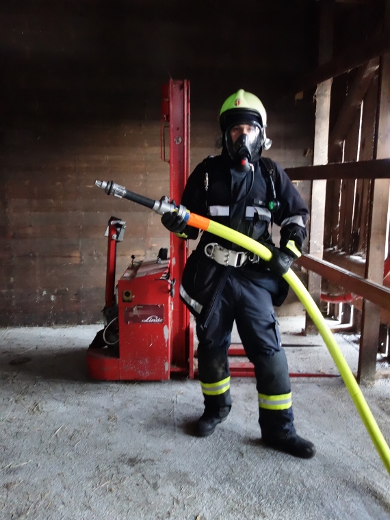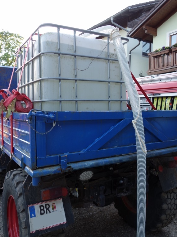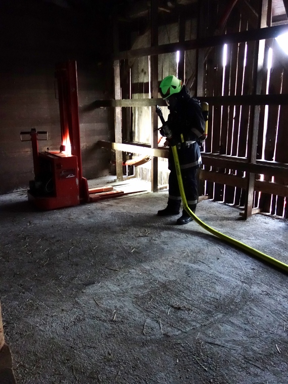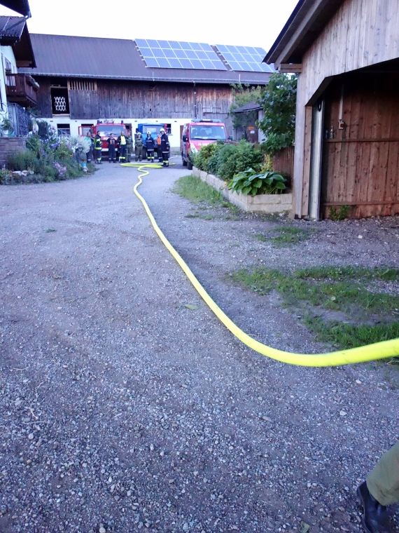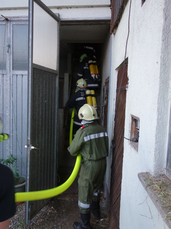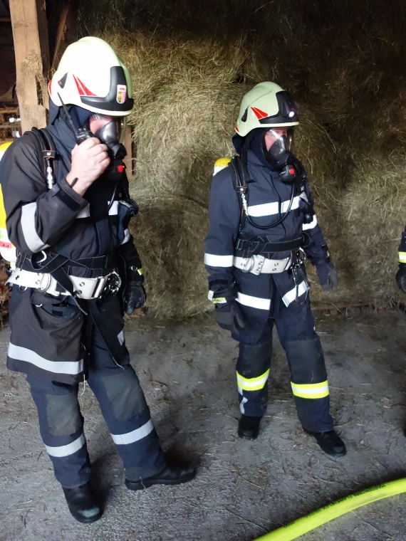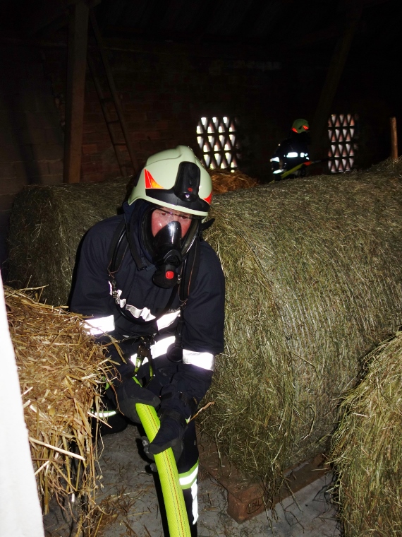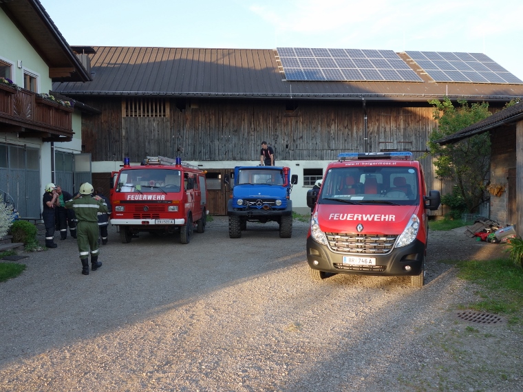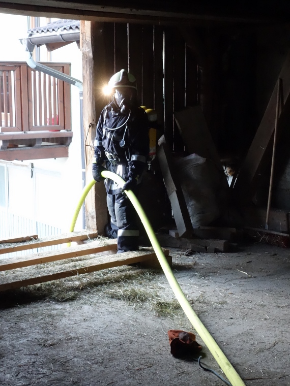 Angenommen wurde ein Löschangriff auf eine brennende Arbeitsmaschine am Heuboden. Da keine Wasserentnahmestelle zur Verfügung stand, wurde kurzfristig mit einem 1000 Liter Wassertank auf einem Privatfahrzeug die Wasserversorgung hergestellt.