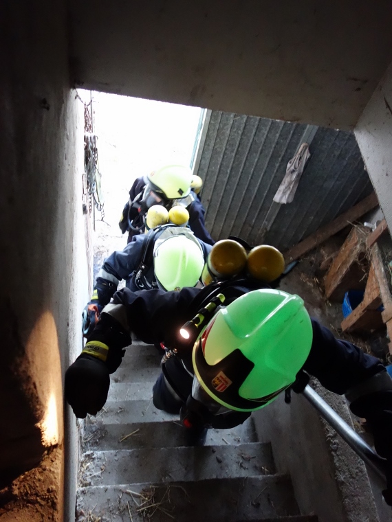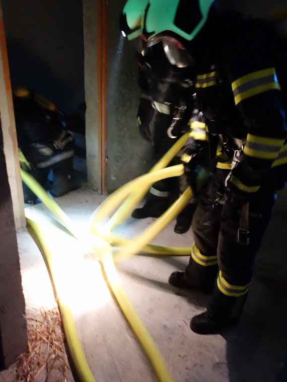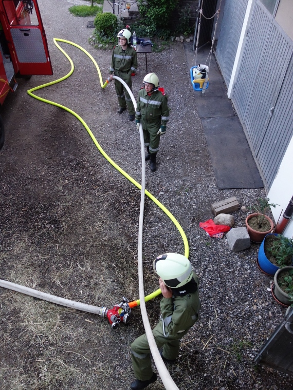Die Leitung zum Strahlrohr wurde in 3 Varianten verlegt. Der erste Atemschutztrupp versuchte den Löschangriff mit gefülltem Strahlrohr, der zweite Trupp zog das gefüllte Strahlrohr mit der Leine nach oben und der dritte Trupp mit leerem Strahlrohr, welches erst vor dem Brandherd gefüllt wurde.