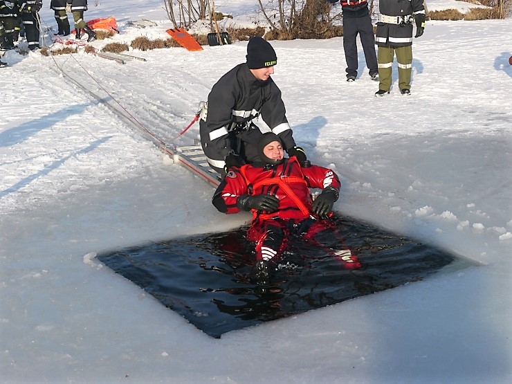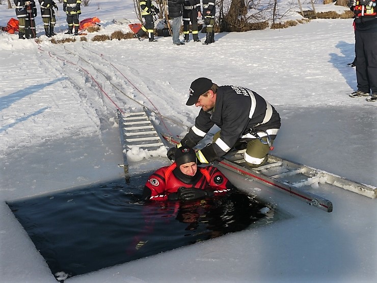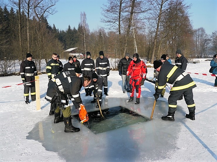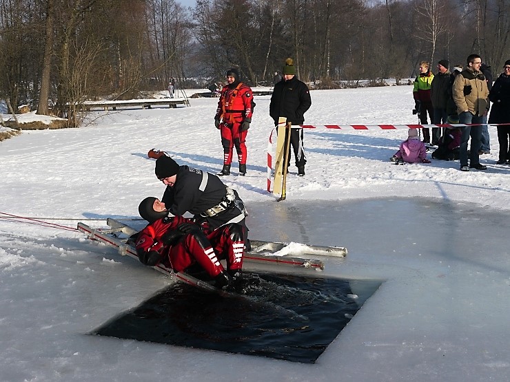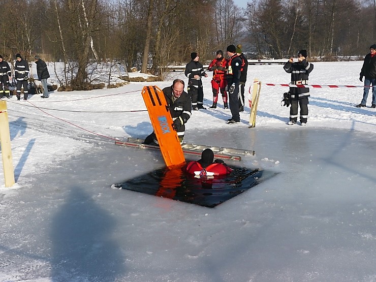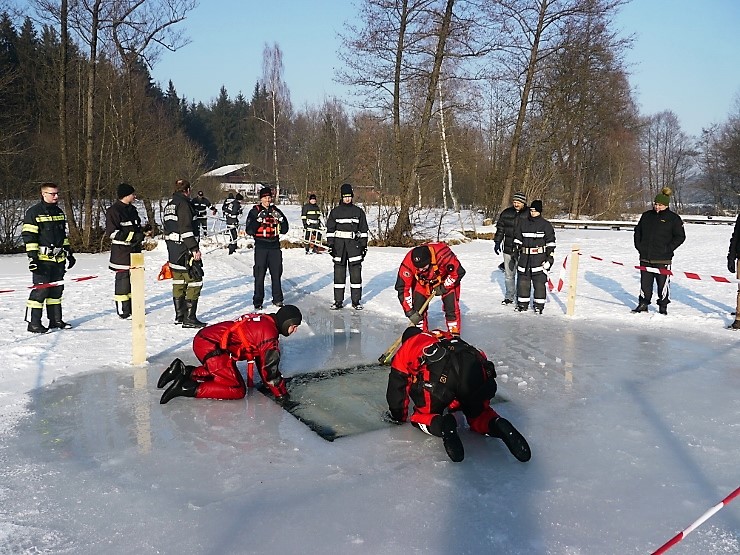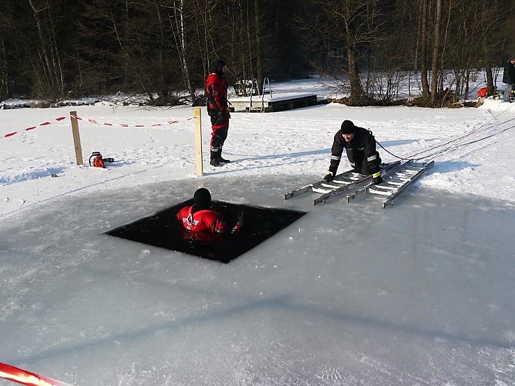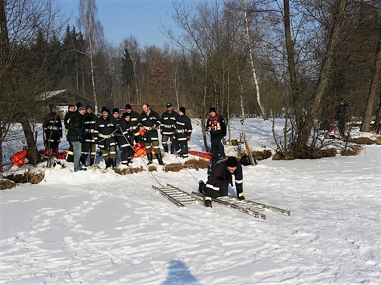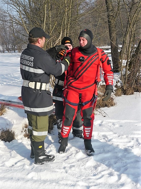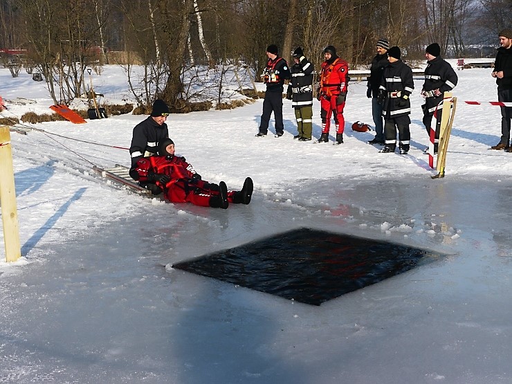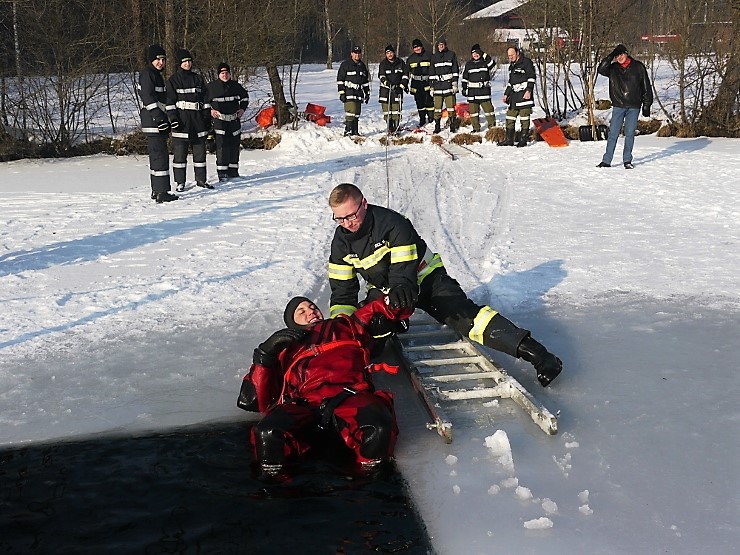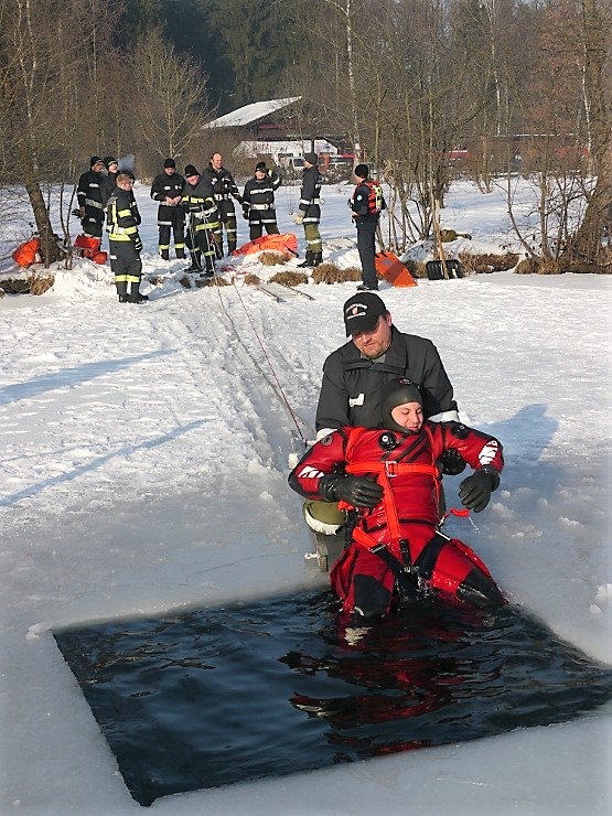 Übungsannahme war eine im Eis eingebrochene Person, die aus der Einbruchstelle gerettet werden soll. Es wurde die Annäherung zur Einbruchstelle mit Leitern und Tragefläche, sowie die Rettung des Unfallopfers mit Beförderung zum Ufer durch mehrere Kameraden geübt. Es wurden uns dabei von der FF Tauchgruppe Braunau einige wichtige Verhaltensregeln erklärt: