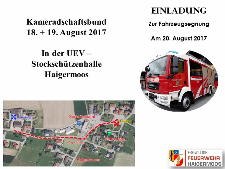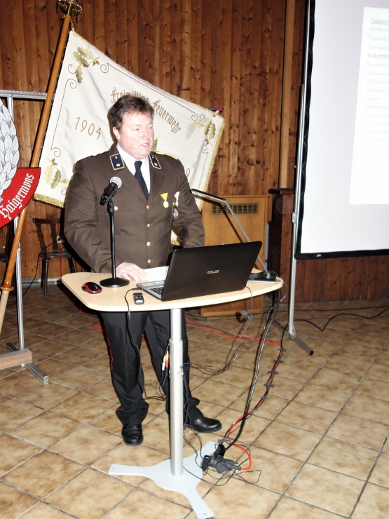 Die 109. Vollversammlung der FF Haigermoos wurde am Samstag, dem 28. Jänner 2017 um 20:00 Uhr im Gasthaus Scharinger eröffnet.Kommandant HBI Erich Stöllberger begrüßt Pfarrer Dechant Konsistorialrat Johann Schausberger, den Bürgermeister und Ehren-Kdt. Hans Schwankner, den Abschnittskommandanten BR Erich Forsthofer, die Ehrenmitglieder, die anwesenden Vertreter des Gemeinderates, unsere Fahnenpatinnen und Marketenderinnen, den Vertreter der Nachbarfeuerwehr Trimmelkam die Vertreter der örtlichen Vereine und Gruppierungen, die Jugendgruppe, das Kommando, das erweiterte Kommando und alle anwesenden Kameraden. |