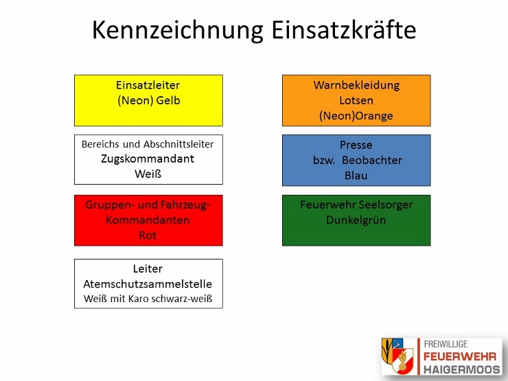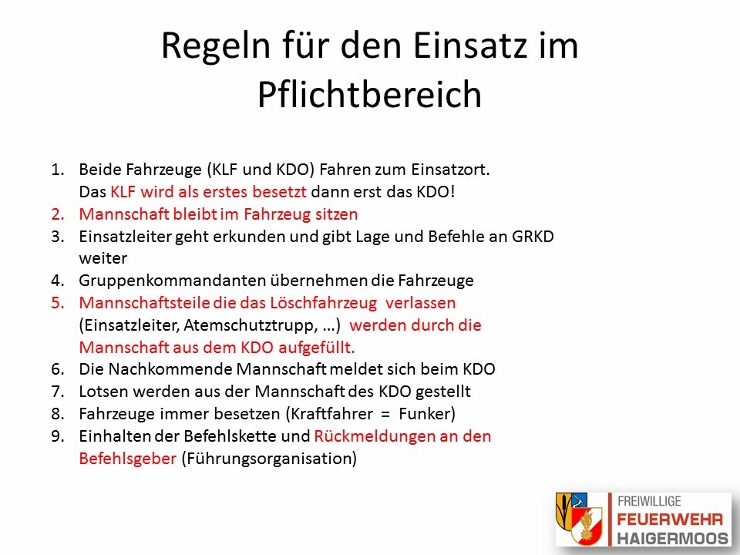 Neben dem Regelkreis und den Regeln für den Einsatz im Pflichtbereich beim Eintreffen am Einsatzort wurde vor allem die Sitzordnung in den Einsatzfahrzeugen geschult. Wichtig ist auch die Kennzeichnung der Einsatzkräfte, zur raschen Erkennung am Einsatzort.