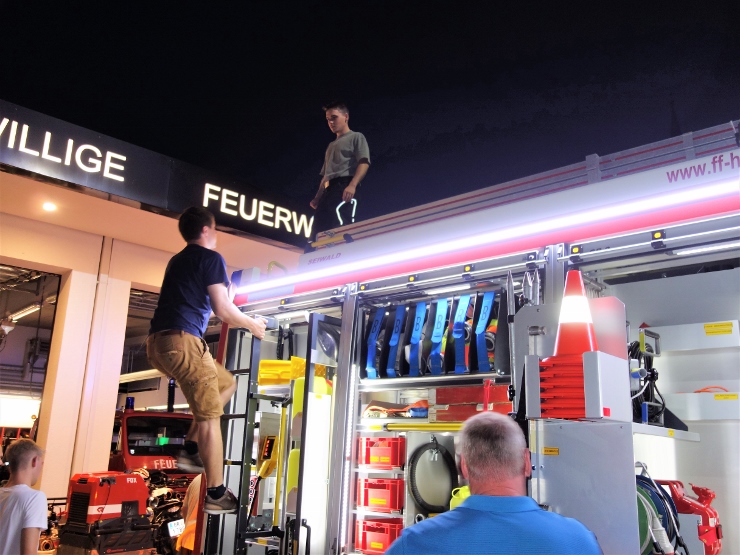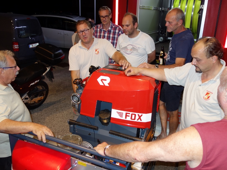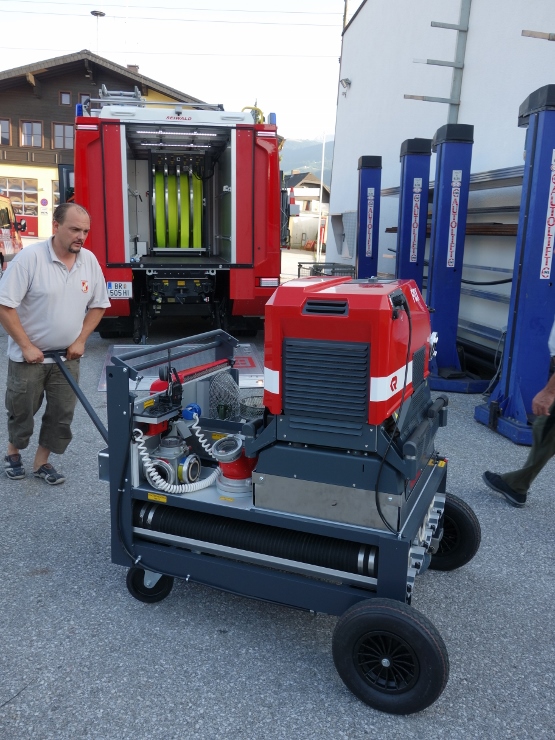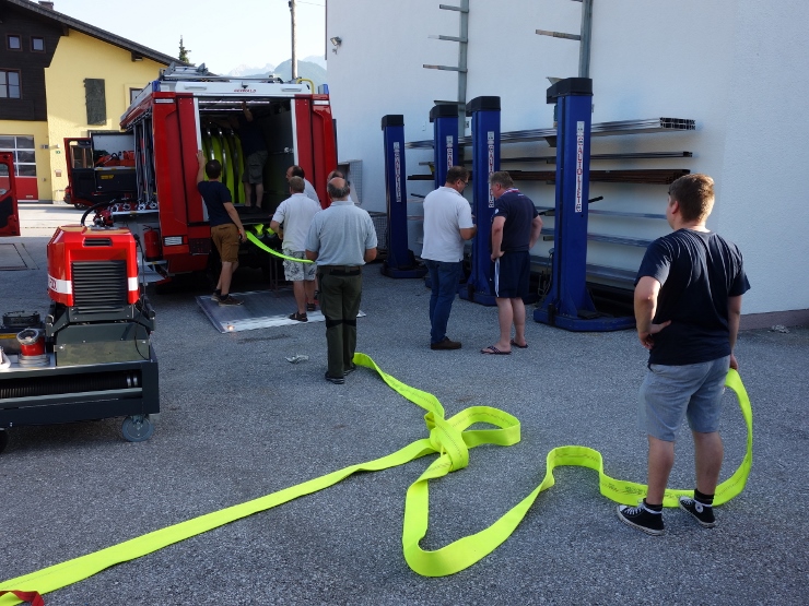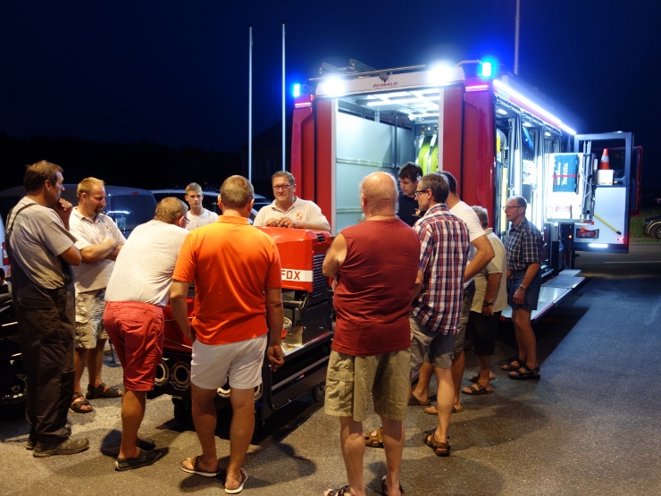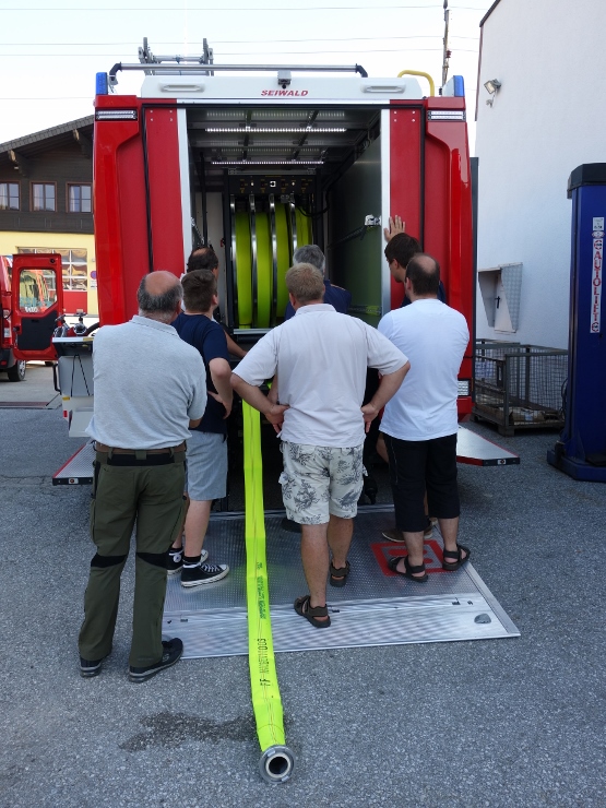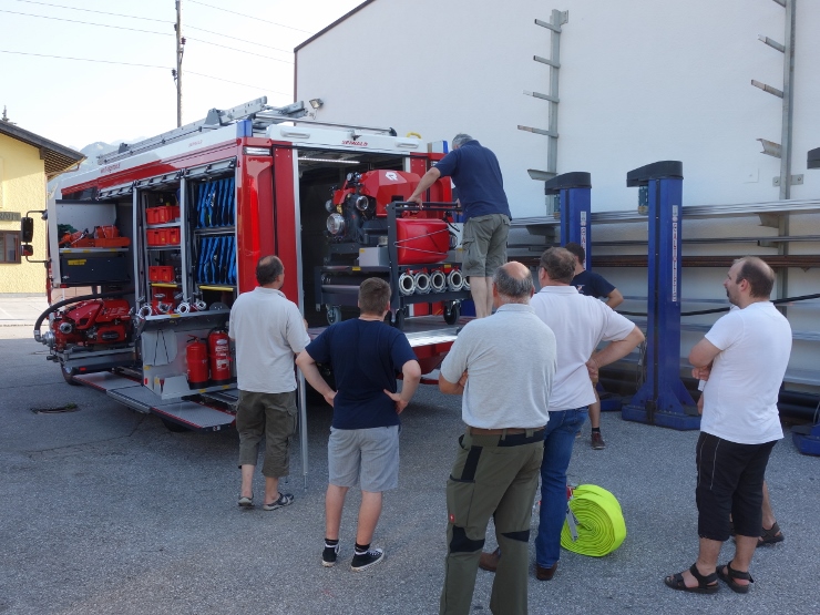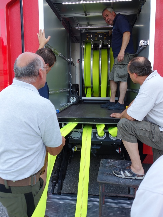 Es wurde gleich vor Ort die Ladebordwand, der fahrbare Saugstellenwagen mit tragbarer Pumpe, Saugschläuchen, einem Schwimmsauger, Leinensätzen und einem Kraftstoffkanister und Zubehör, alles was man für einen Einsatz weiter weg vom Fahrzeug benötigt, besichtigt und getestet.