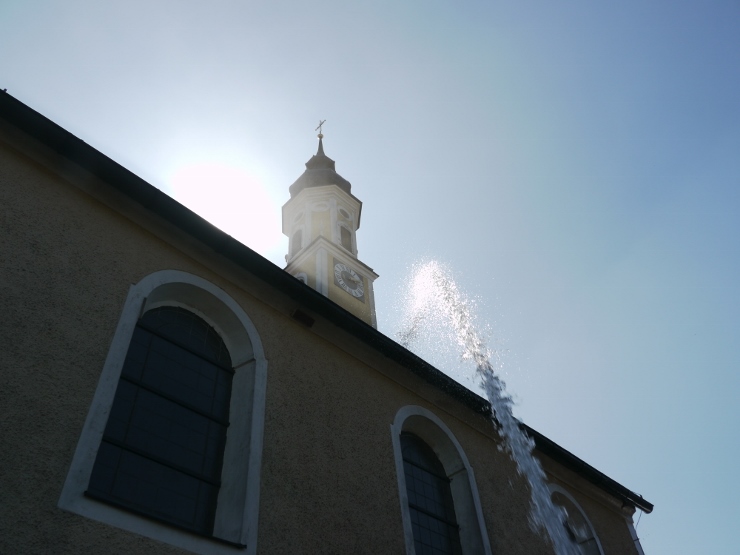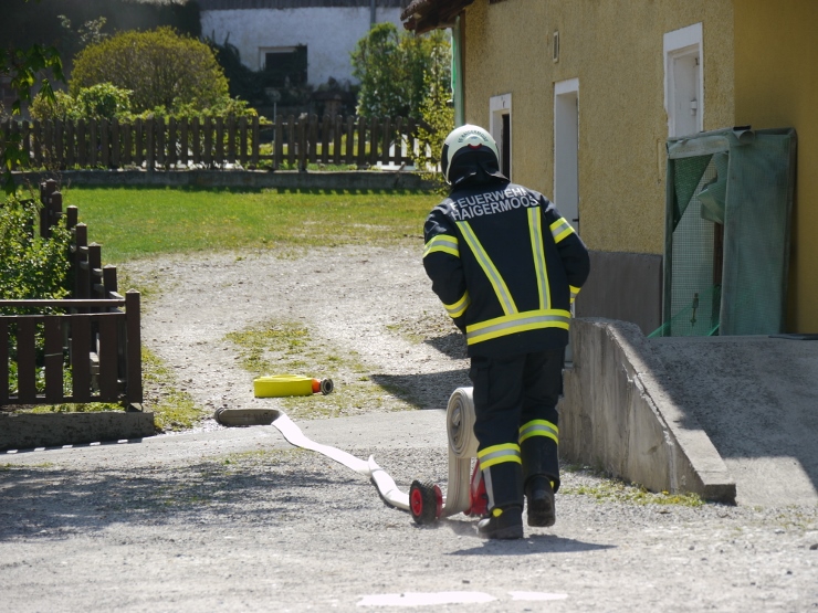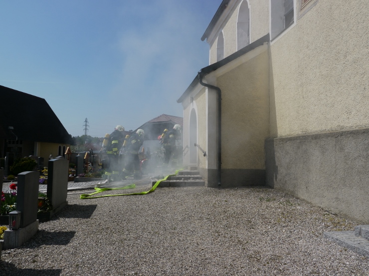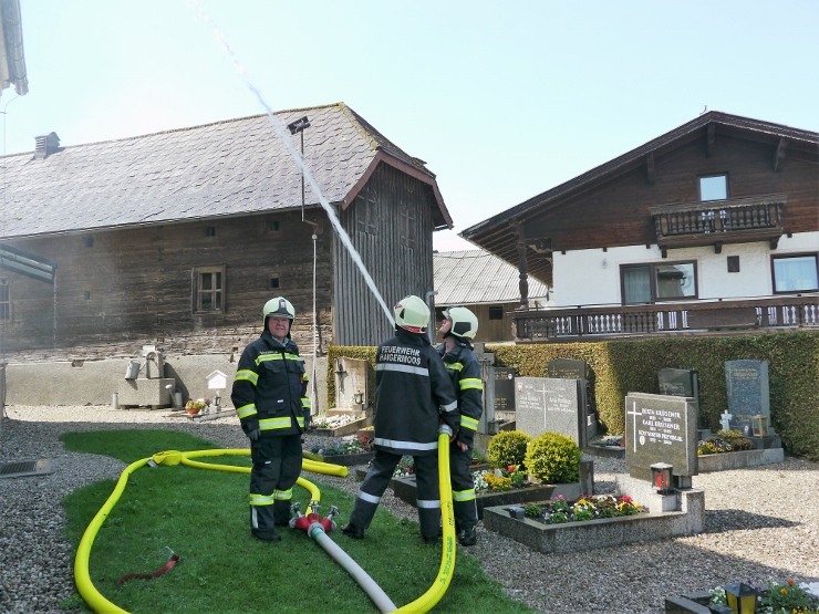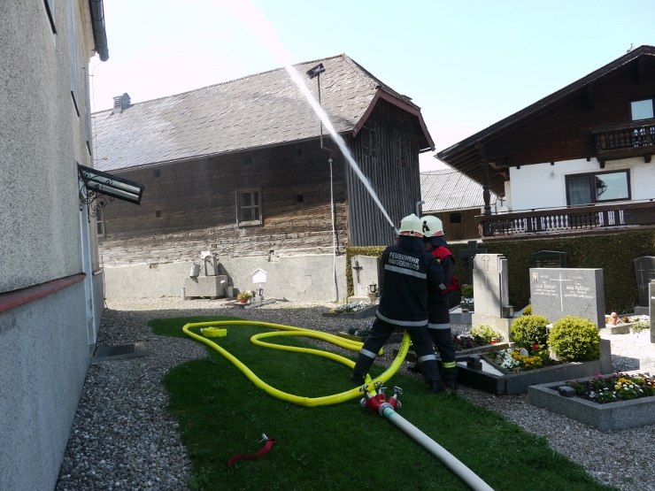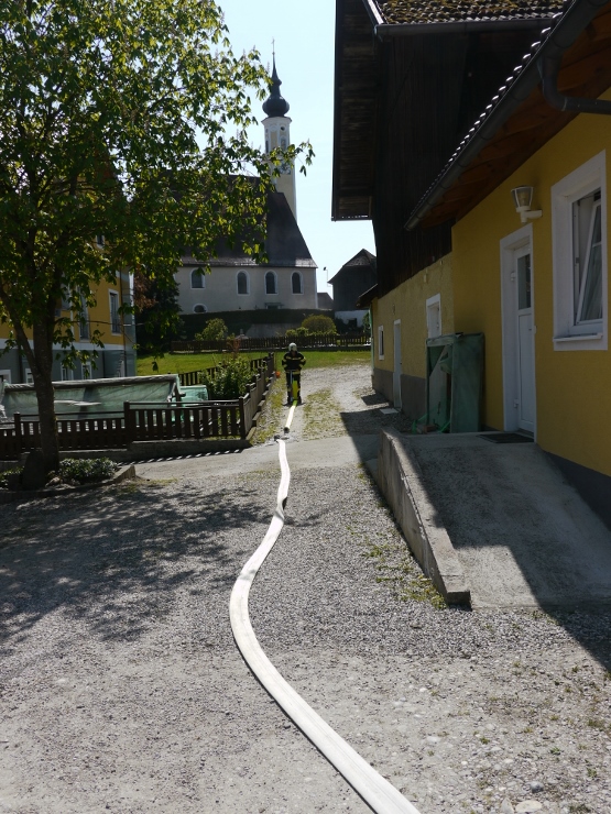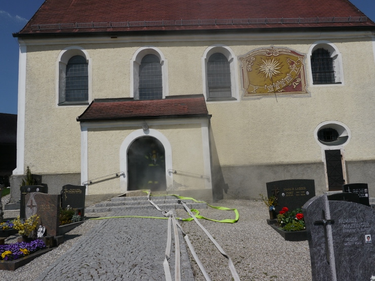 Übungsannahme war ein Brand in der Kirche Franking. Die FF Haigermoos stellte einen Atemschutztrupp zur Rettung von verletzten Personen aus dem stark verrauchten Kirchengebäude. Für den Löschangriff mit einem C Rohr wurde von der FF Haigermoos eine Zubringerleitung vom Hydranten an der Ortsausfahrt (Pumpe) bis neben das Kirchengebäude gelegt.