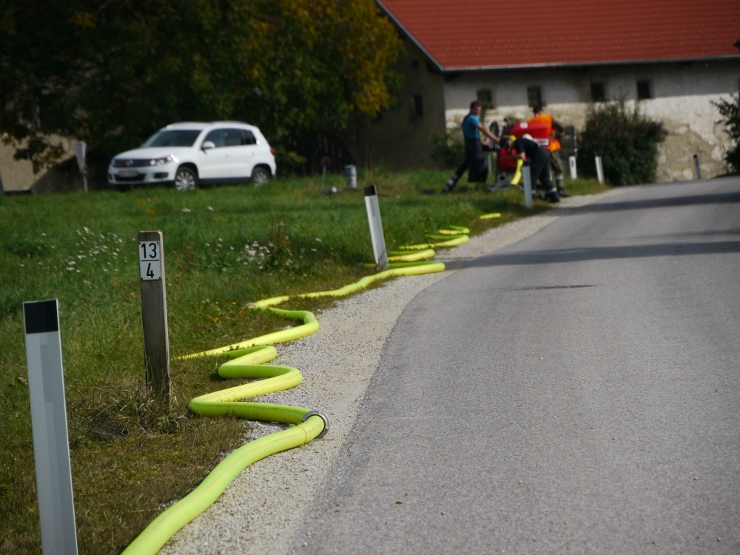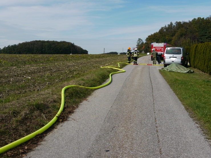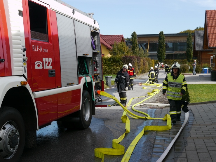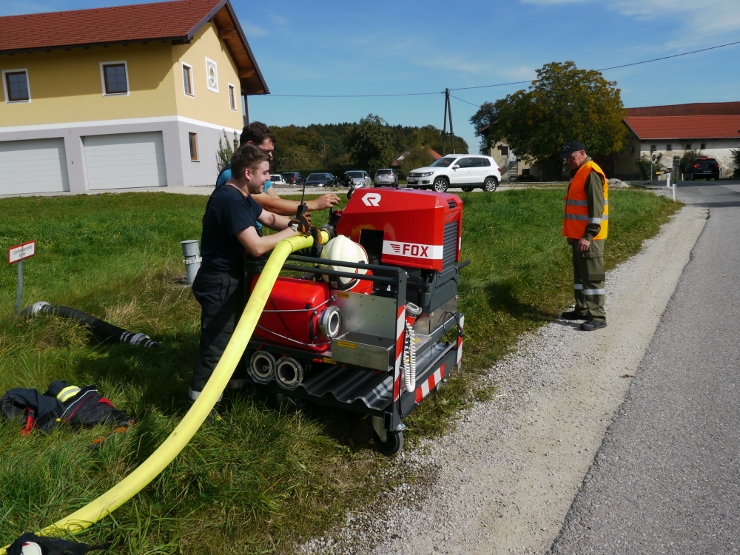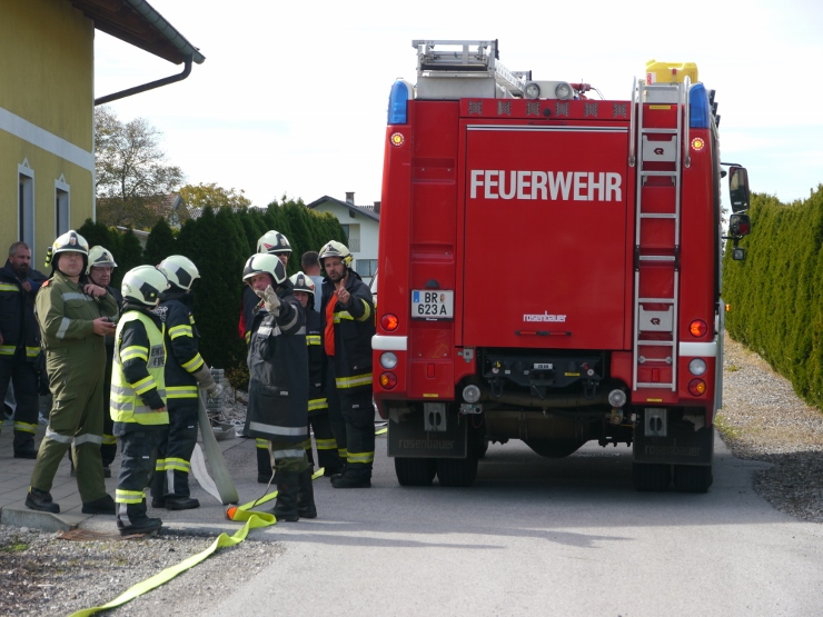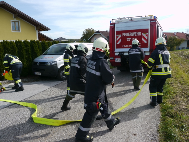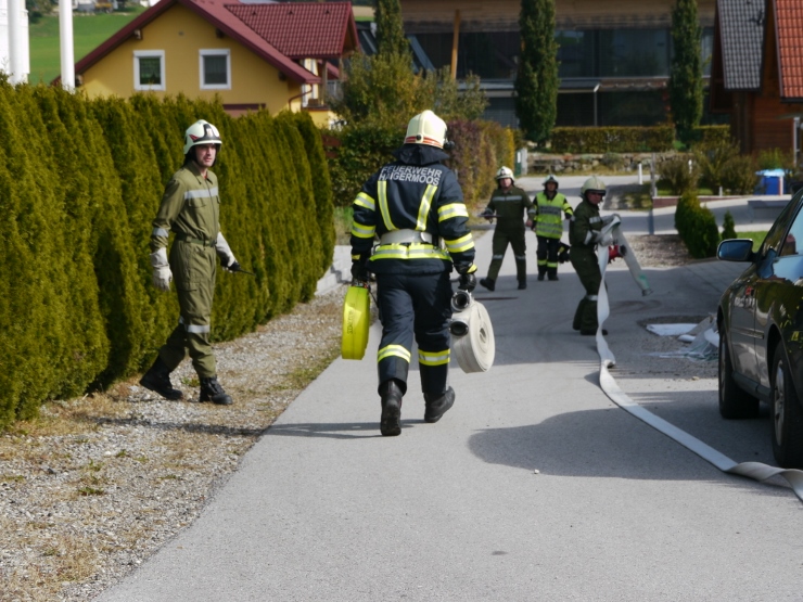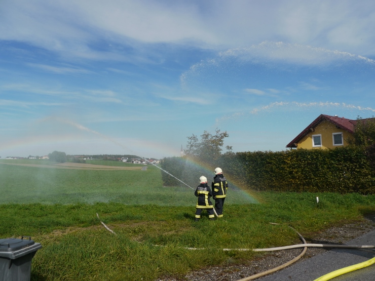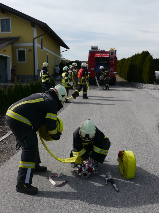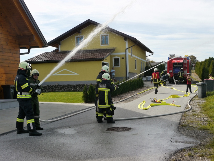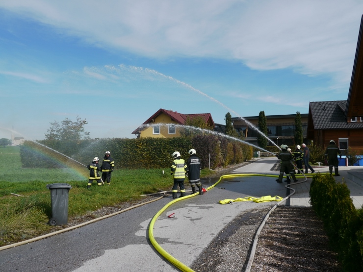 Nach der Einweisung im Feuerwehrhaus erfolgte der Löschangriff gemeinsam mit der FF Trimmelkam mit 3 C-Rohren im Ortsteil Weyer. Mit dem LFA wurde eine Zubringerleitung vom Löschwasserbehälter beim Gasthof Spick bis zum Brandobjekt gelegt.