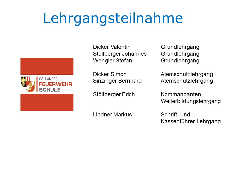 Der Kommandant Erich Stöllberger bedankt sich herzlich für die gute Zusammenarbeit im abgelaufenen Jahr, allen Mitgliedern für die aufgewendeten Arbeitsstunden und die gute Kameradschaft, für die zahlreiche Anteilnahme an den kirchlichen Veranstaltungen in unserer Gemeinde, für die zahlreichen Ausrückungen zu den Feuerwehrfesten und auch für die tatkräftige Mithilfe unserer Frauen.