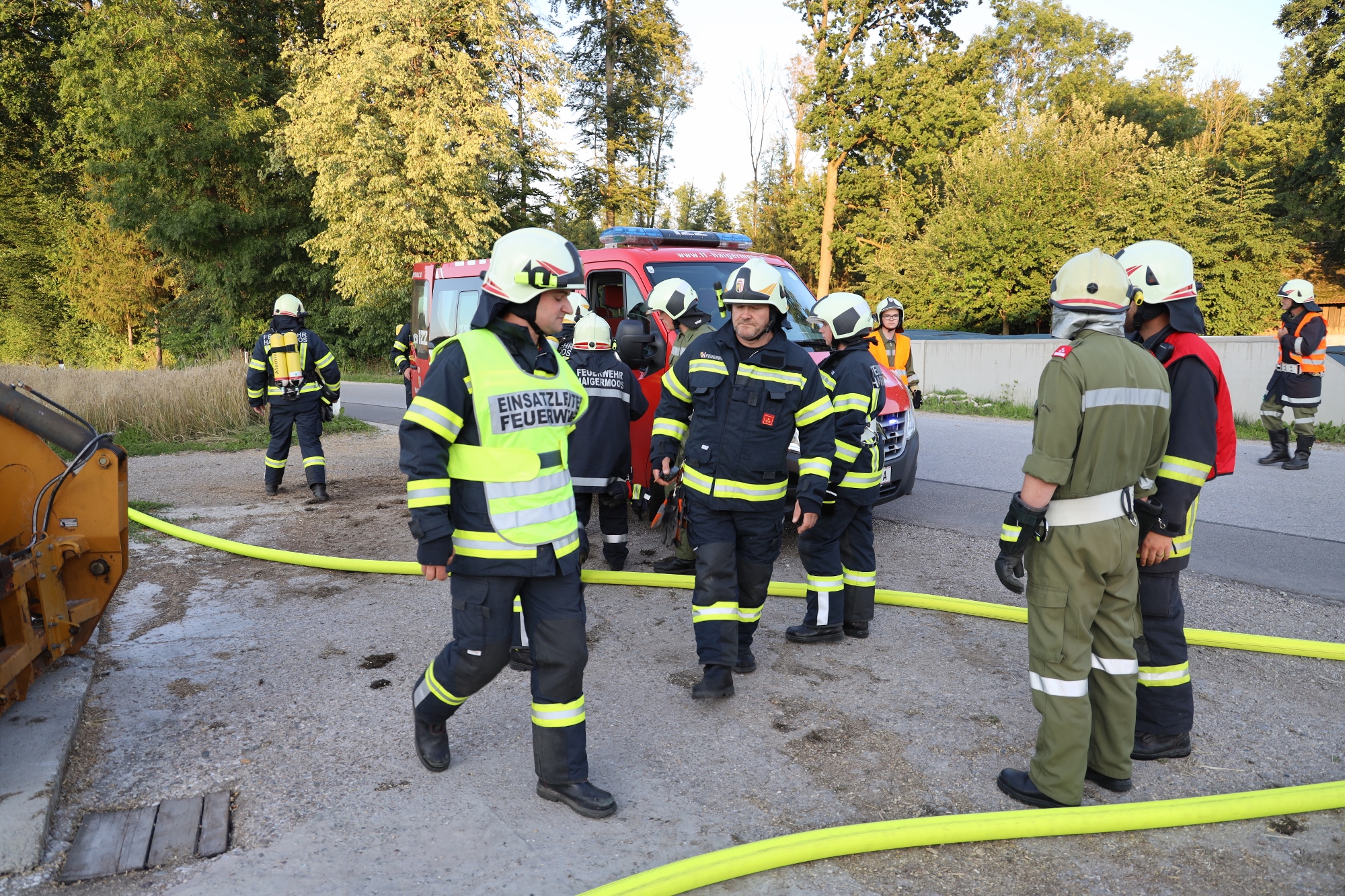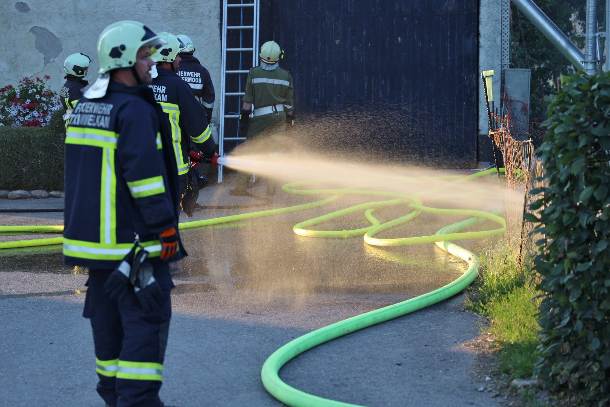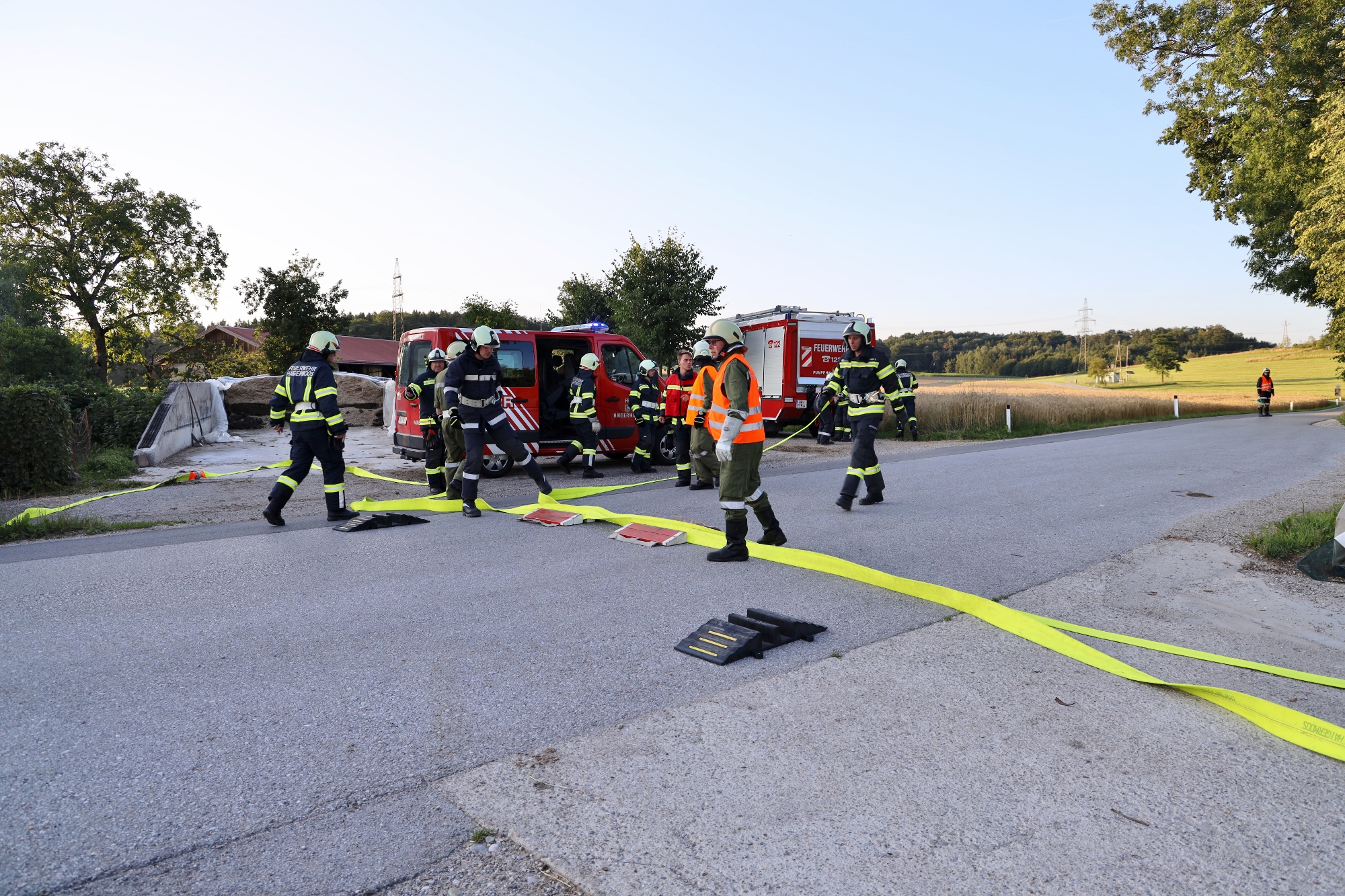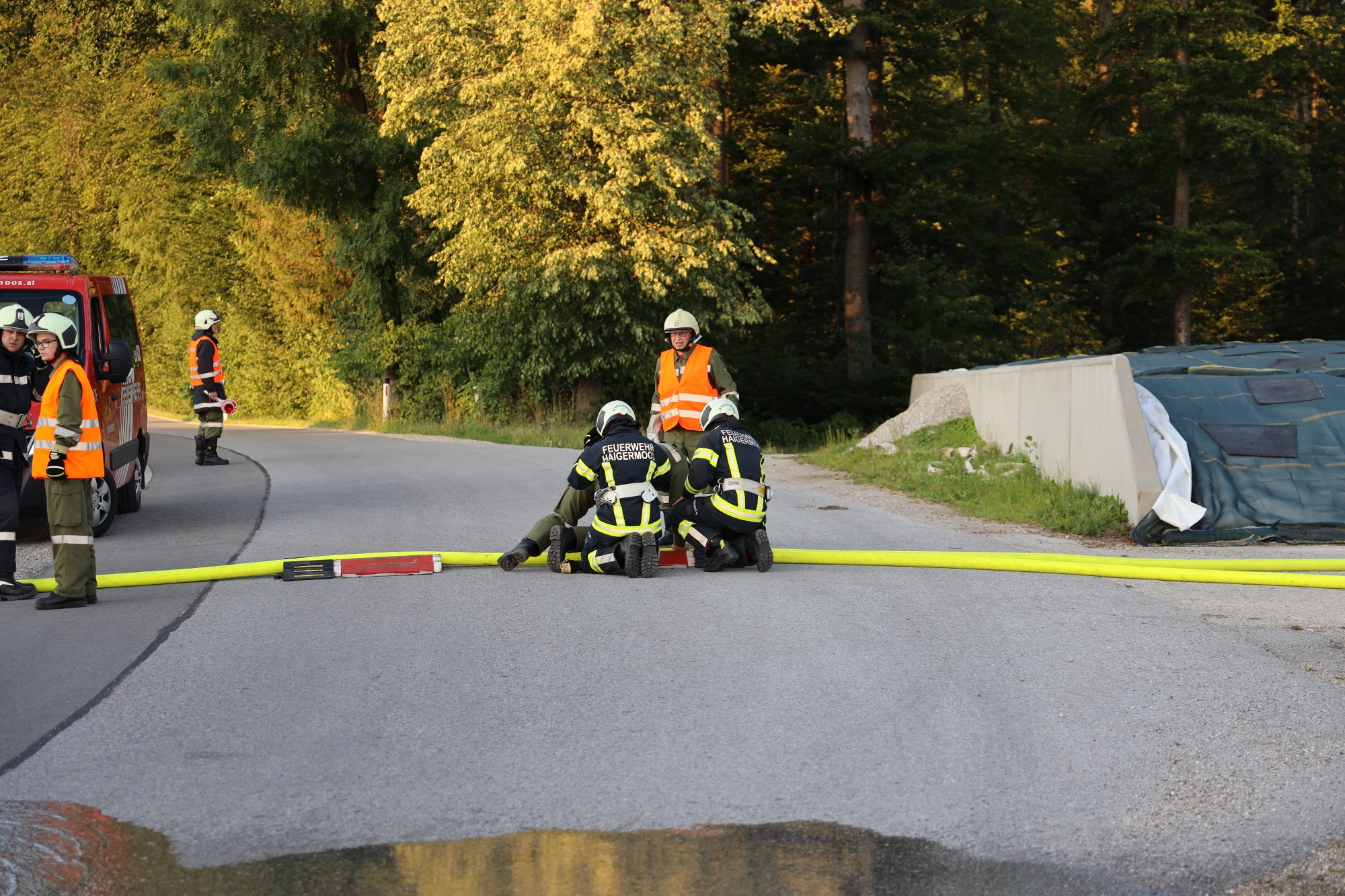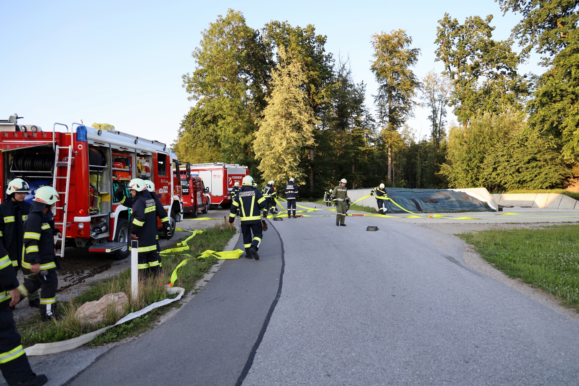 Gemäß den neuen Alarmplänen werden bei einem Brandeinsatz der FF Haigermoos zwei Tanklöschfahrzeuge alarmiert. Die FF Haigermoos verlegte die Zubringerleitung vom Löschteich zum Brandobjekt.