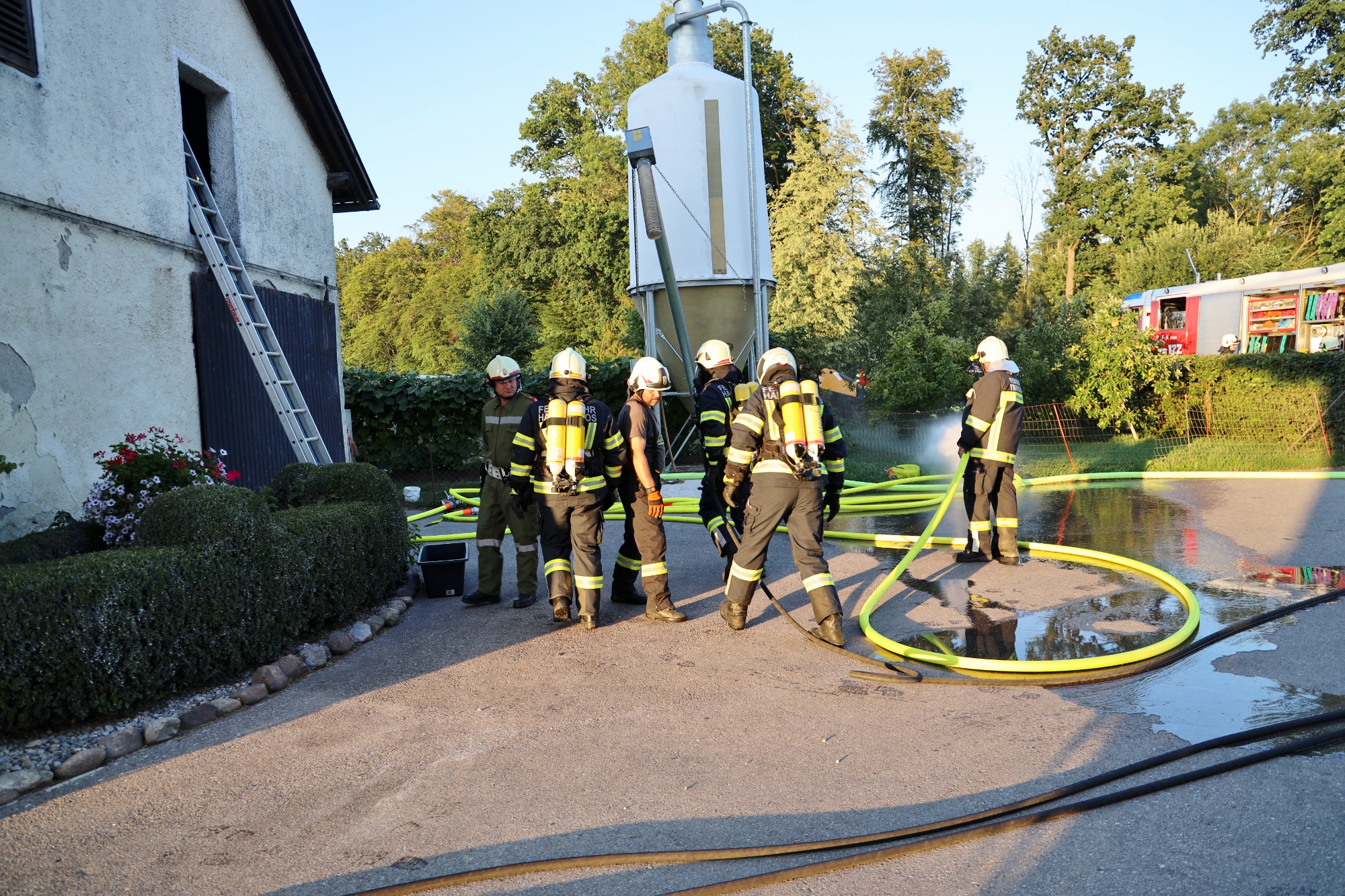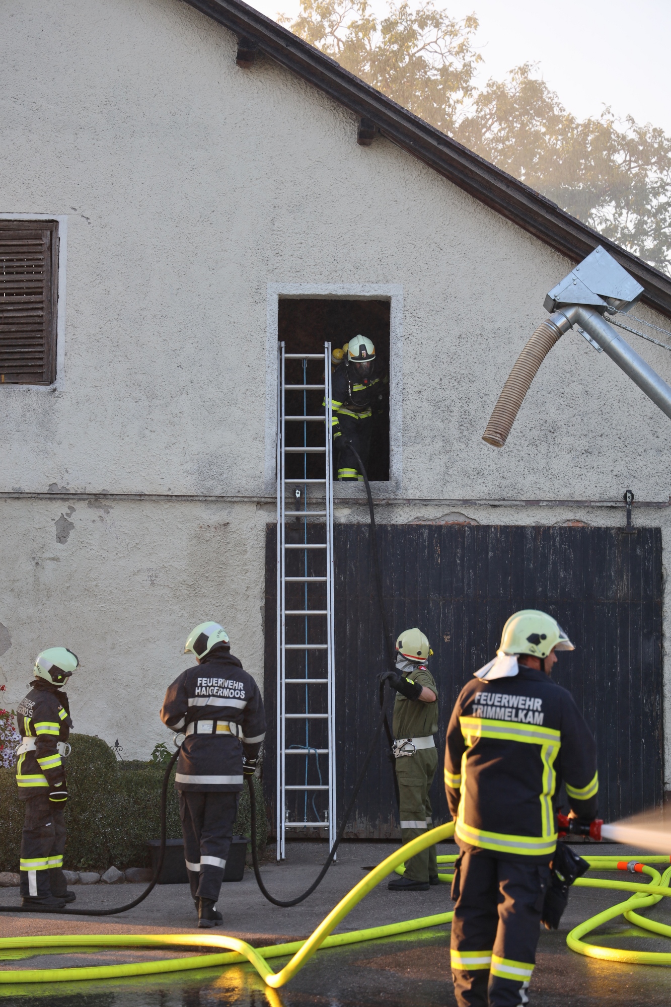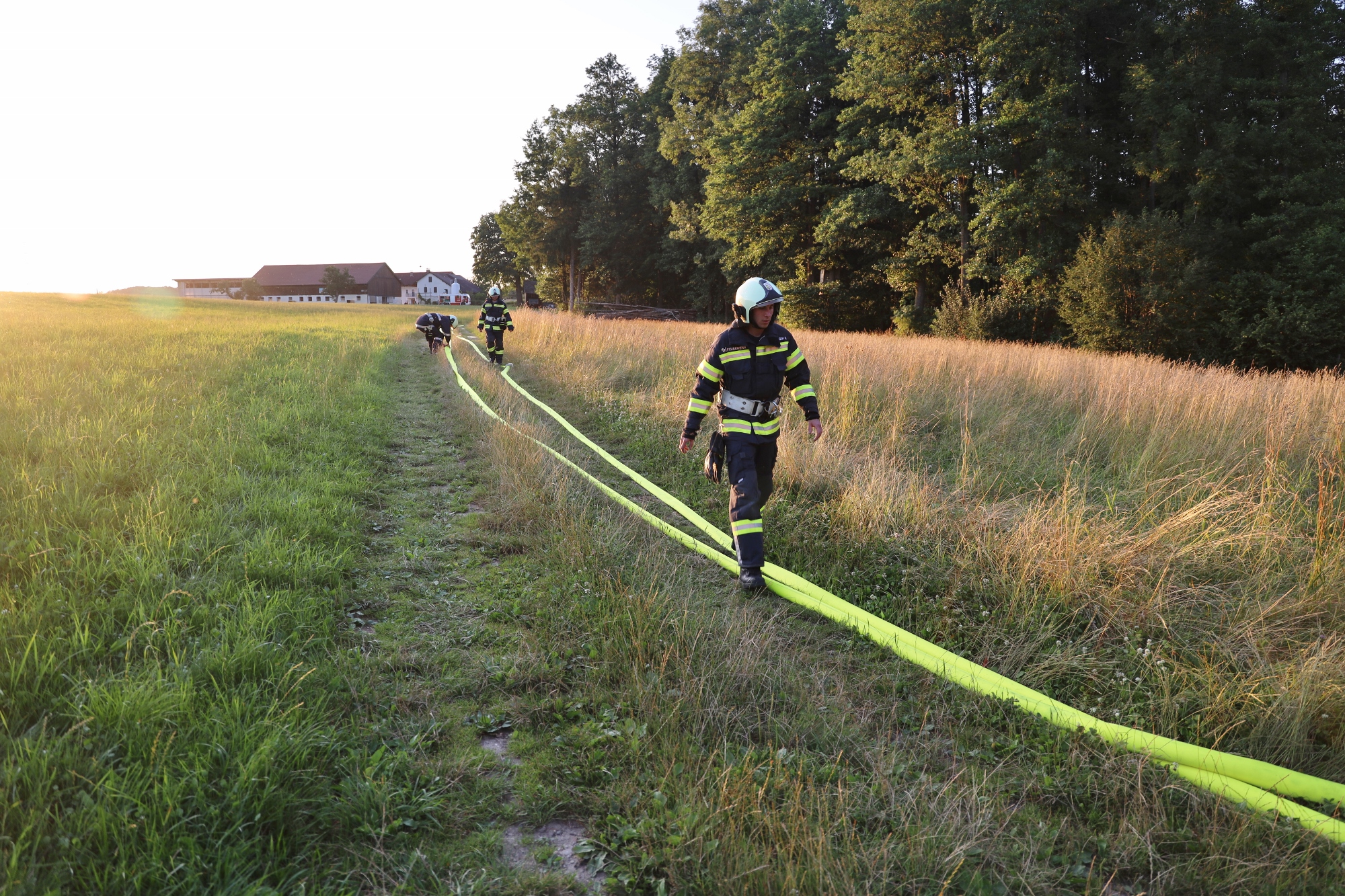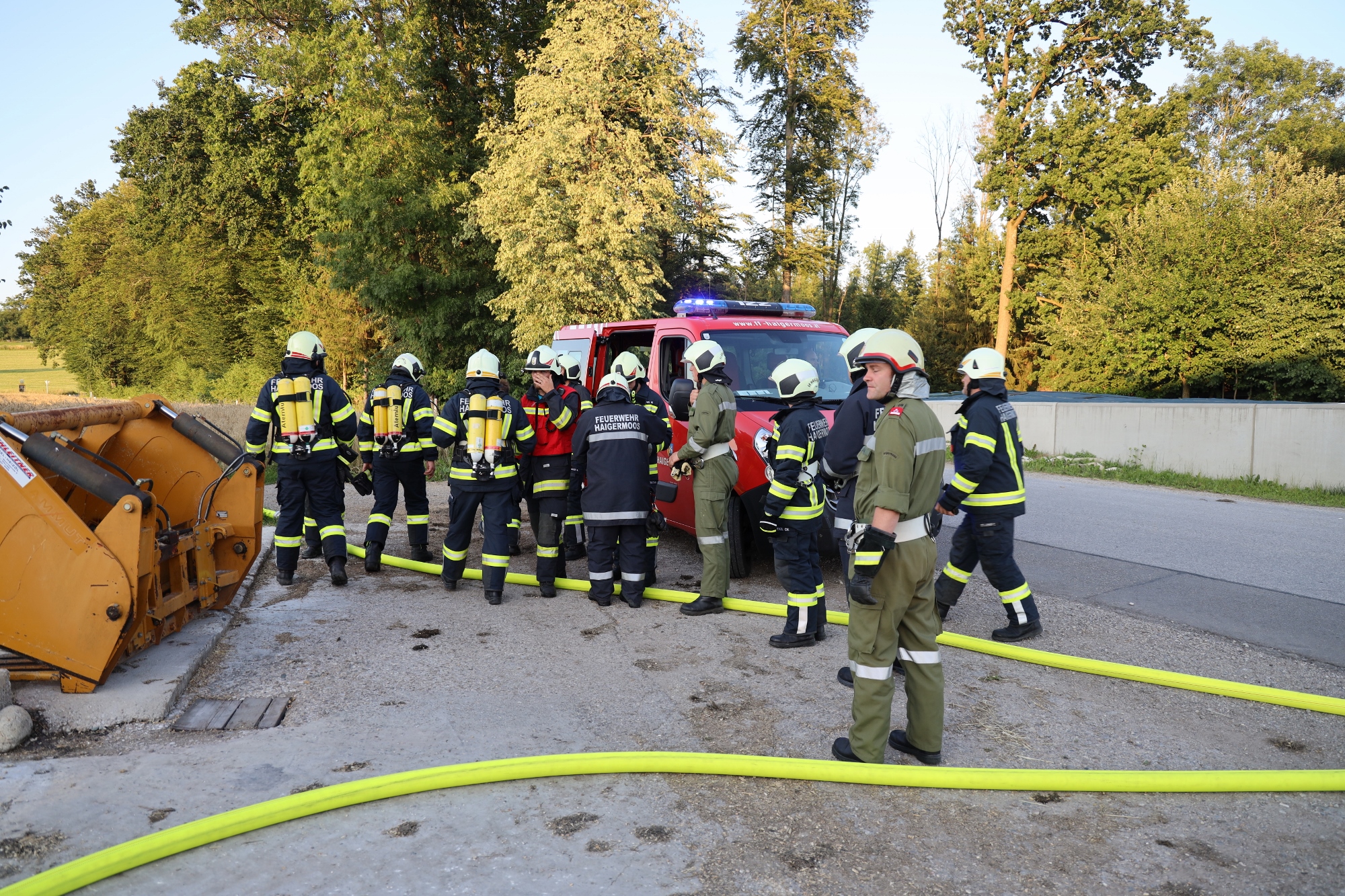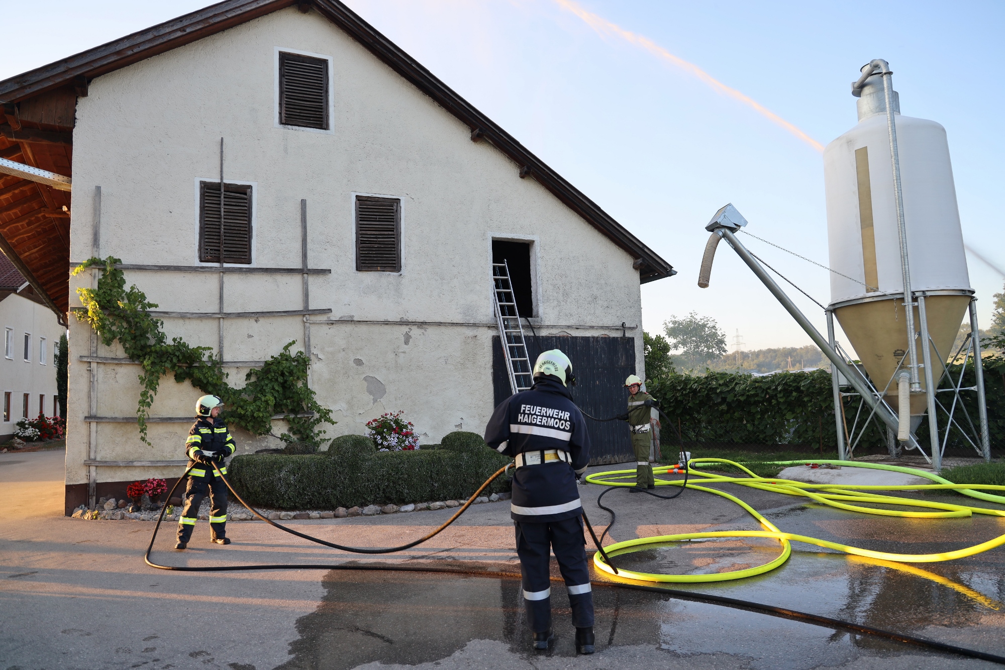 Gemäß den neuen Alarmplänen werden bei einem Brandeinsatz der FF Haigermoos zwei Tanklöschfahrzeuge alarmiert. Die FF Haigermoos verlegte die Zubringerleitung vom Löschteich zum Brandobjekt.