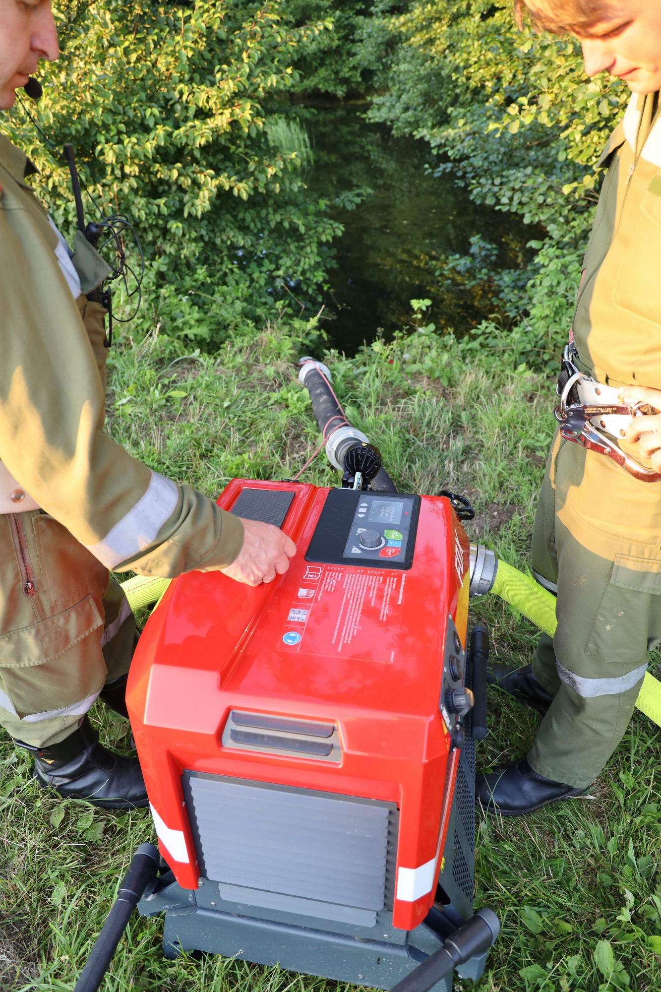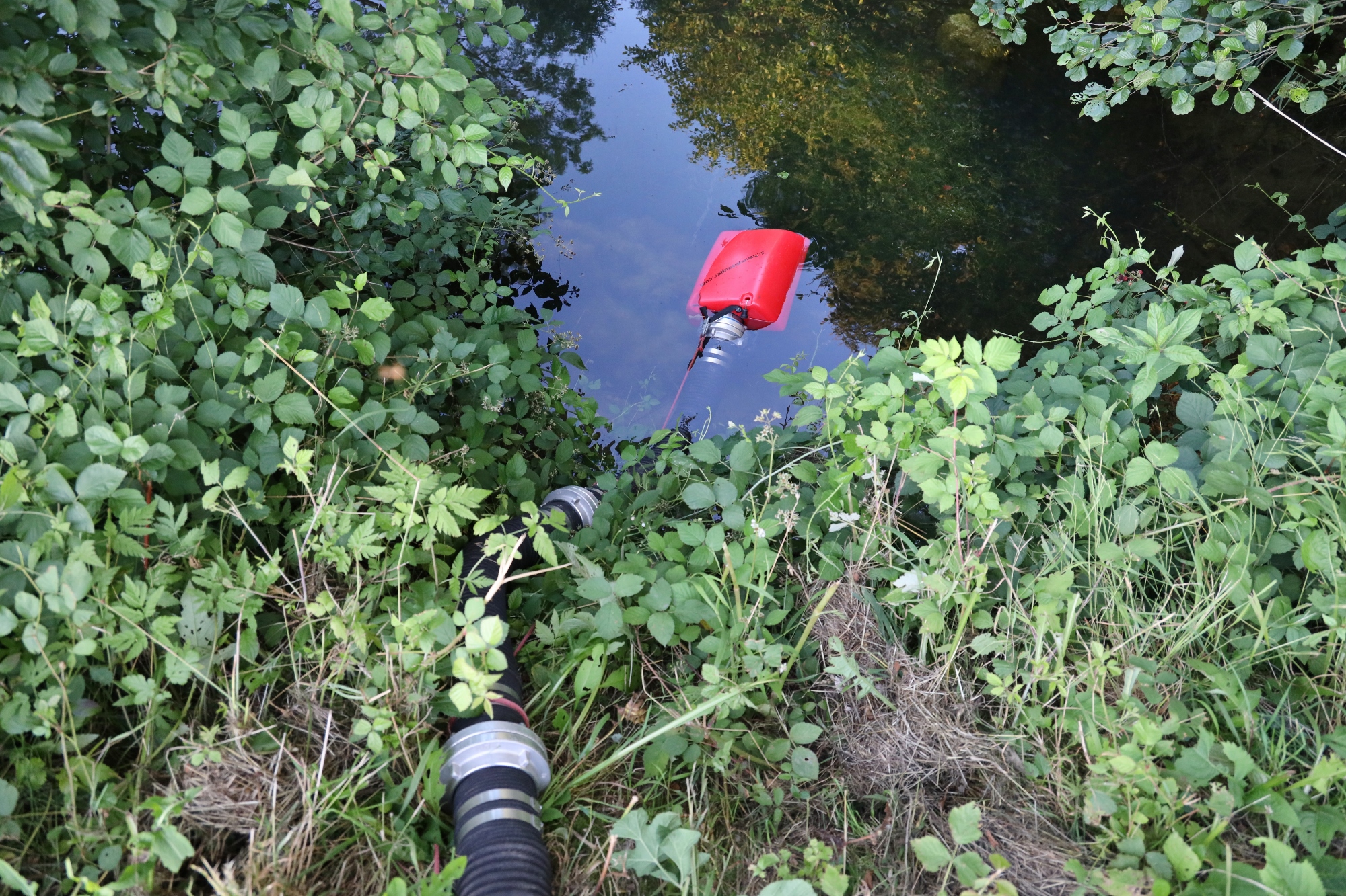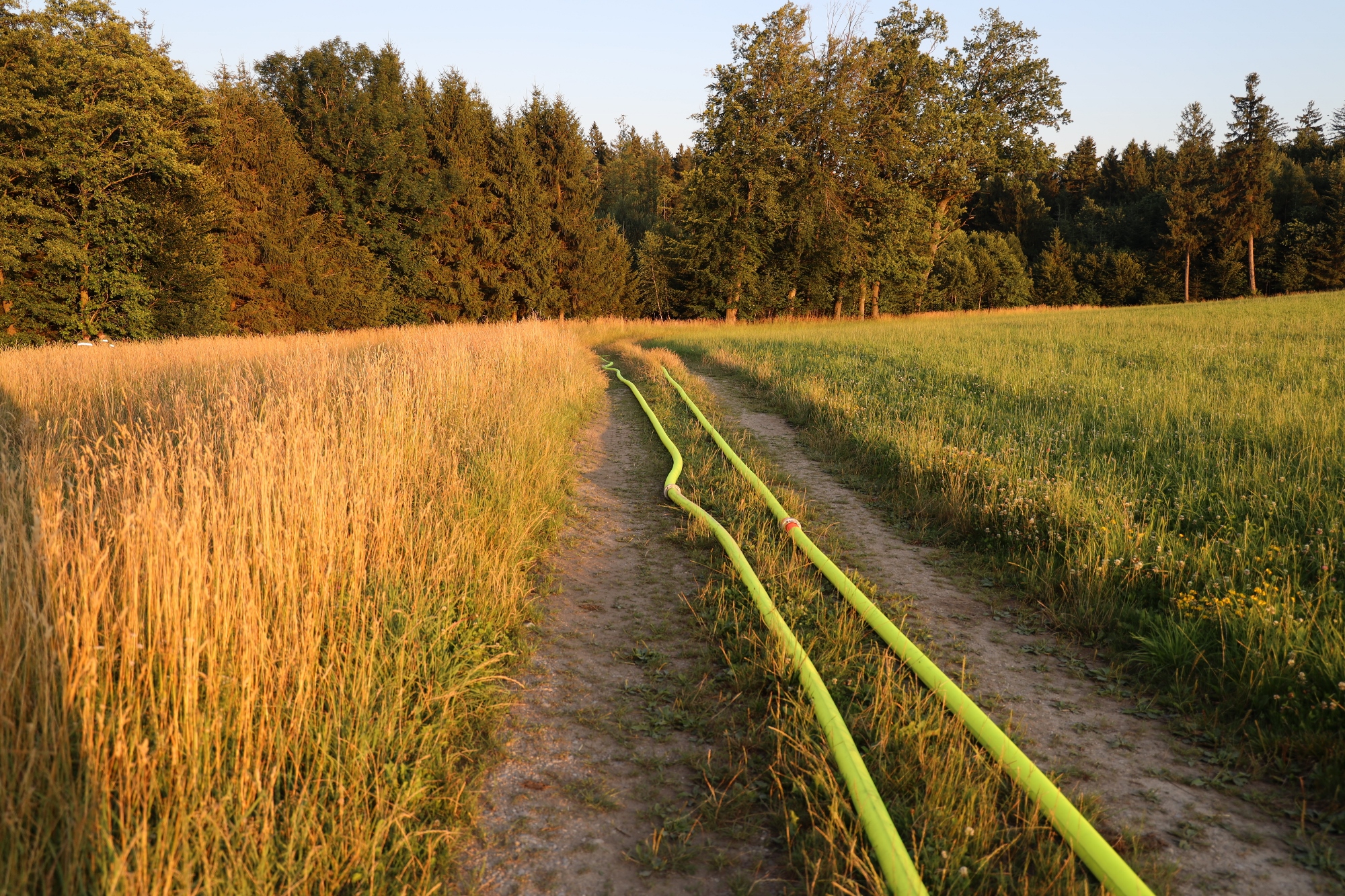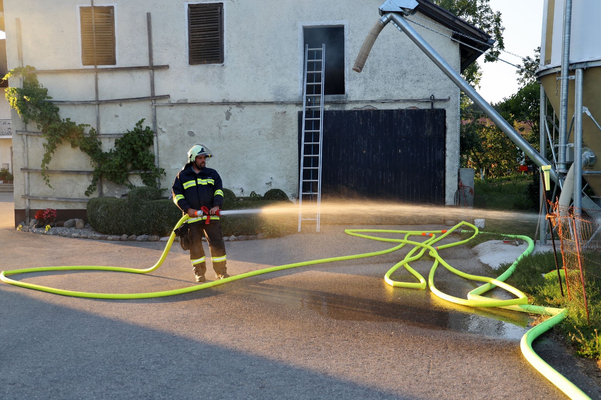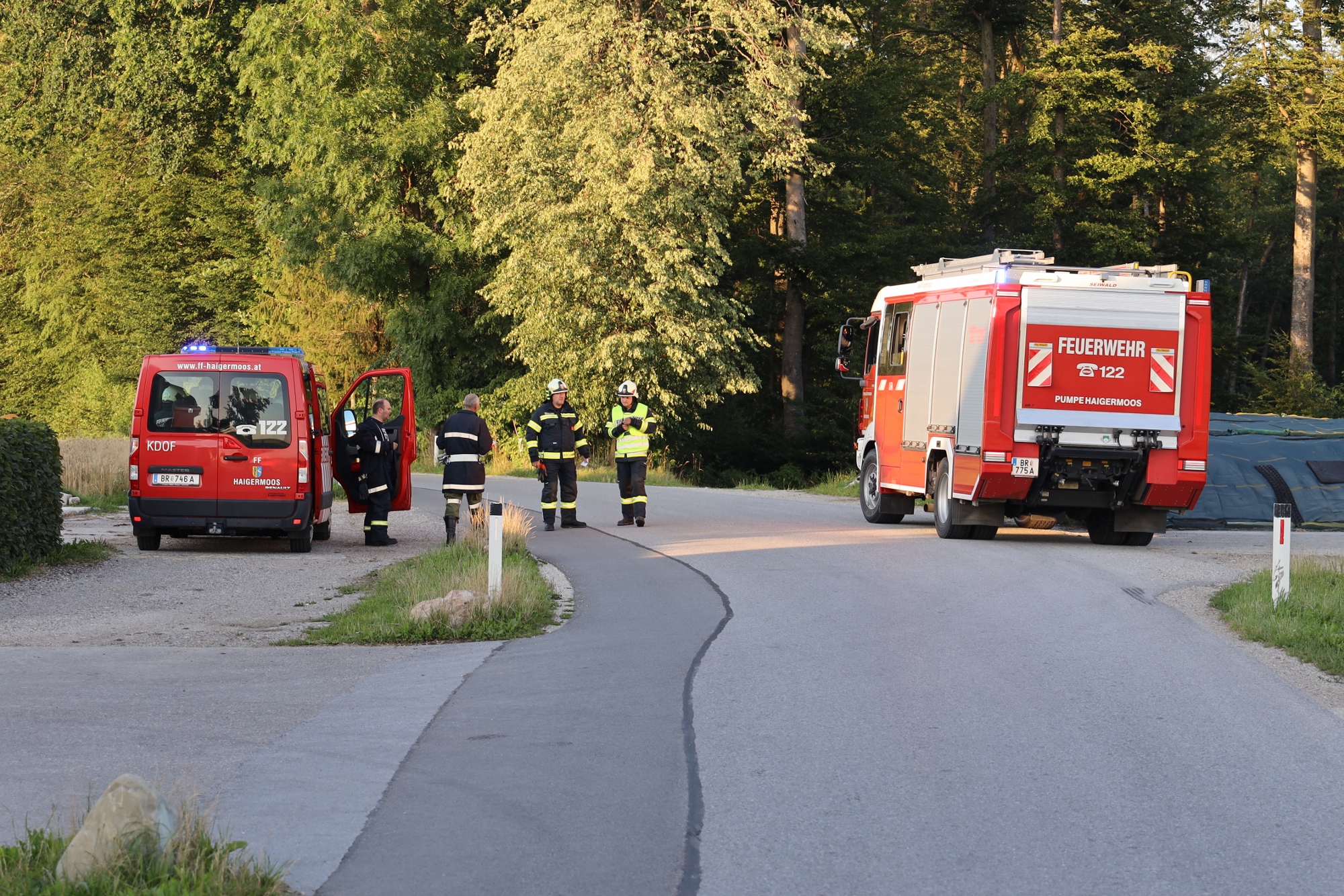 Gemäß den neuen Alarmplänen werden bei einem Brandeinsatz der FF Haigermoos zwei Tanklöschfahrzeuge alarmiert. Die FF Haigermoos verlegte die Zubringerleitung vom Löschteich zum Brandobjekt.