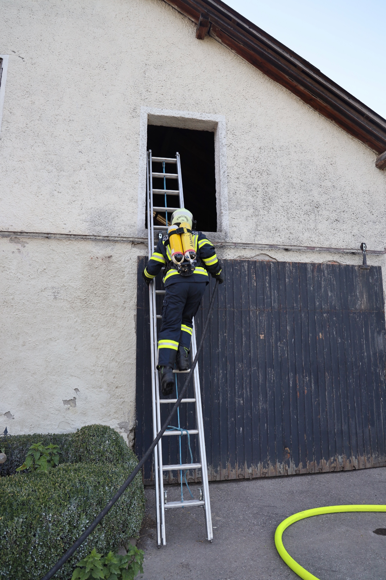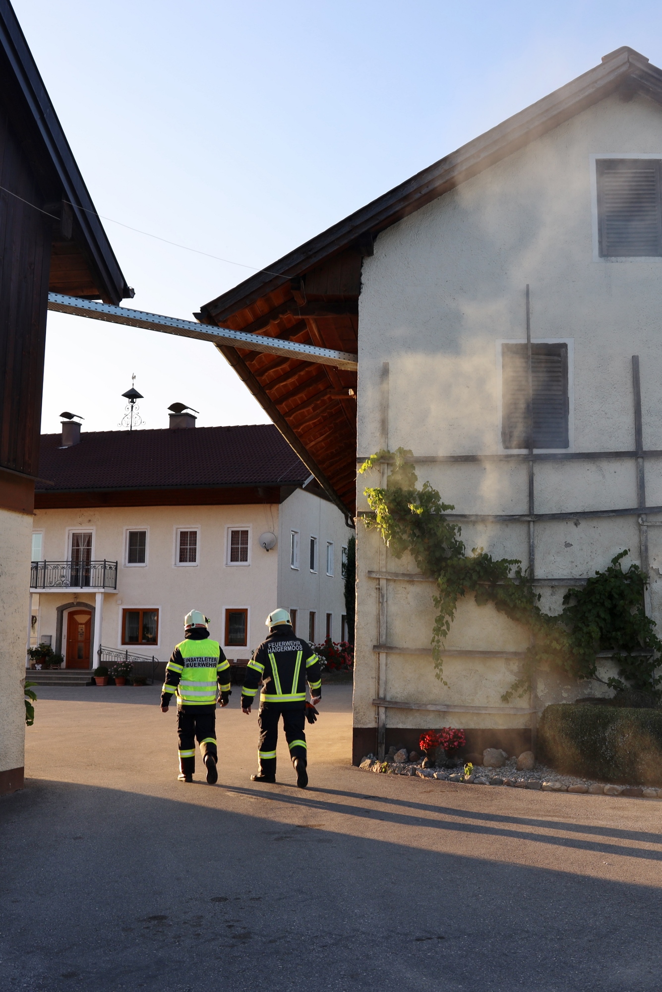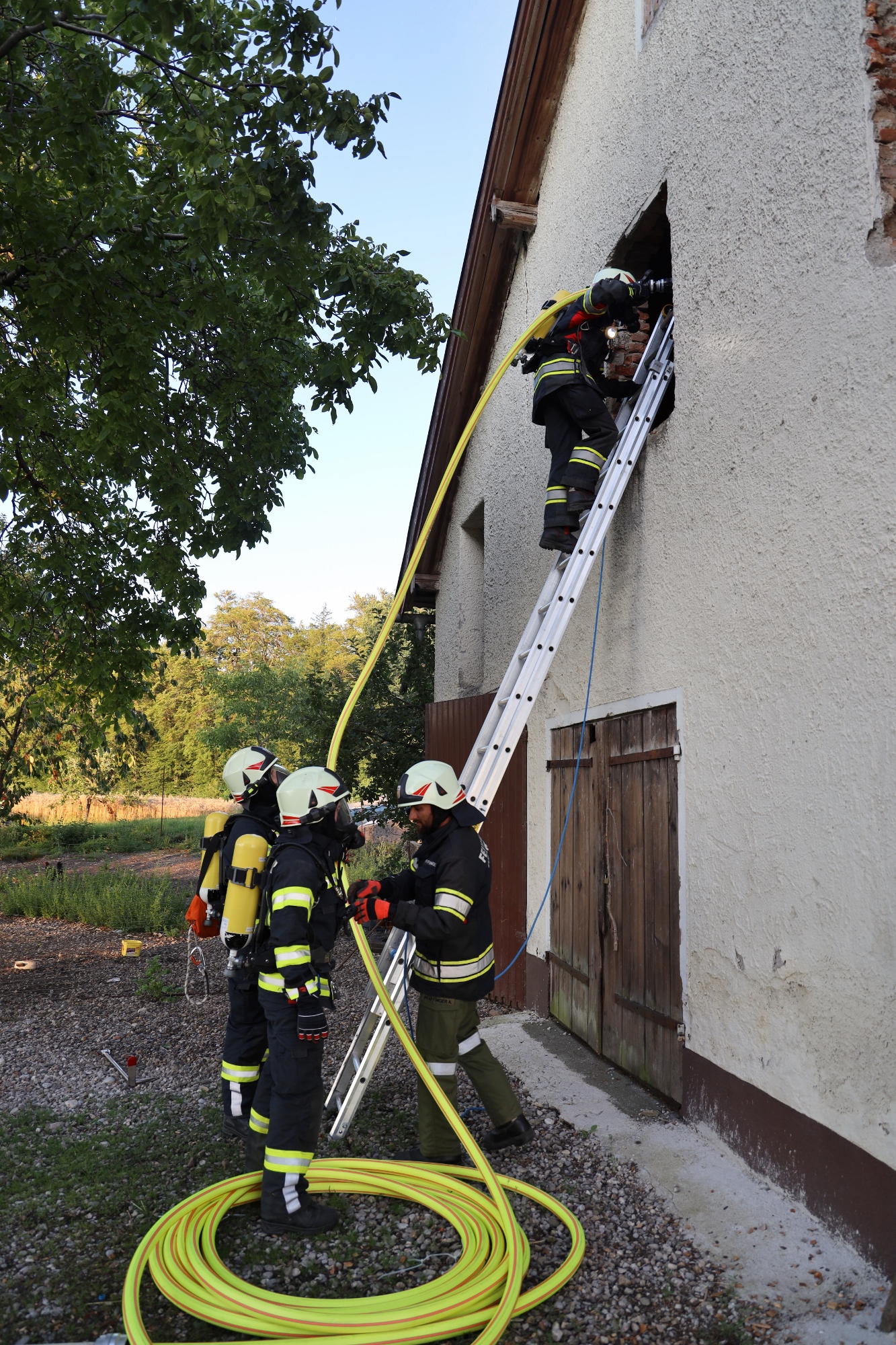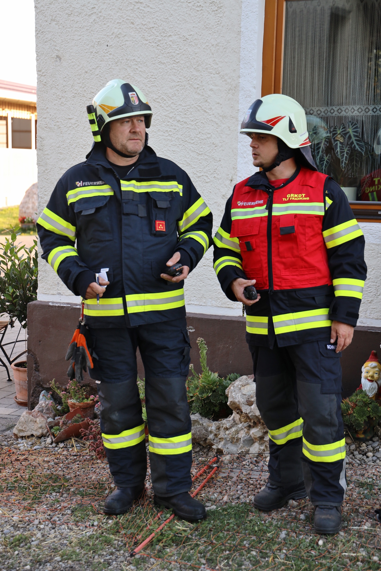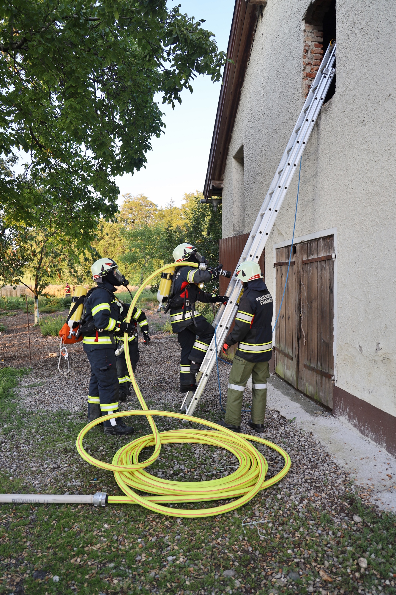Angenommen wurde ein Brand im Obergeschoß des Nebengebäudes. Der Löschangriff wurde von beiden Giebelseiten von je einem Atemschutztrupp der FF Haigermoos und FF Franking unterstützt. Mit einer Wärmebildkamera konnten unsere Kameraden das Auffinden von warmen Objekten üben.