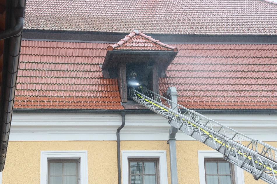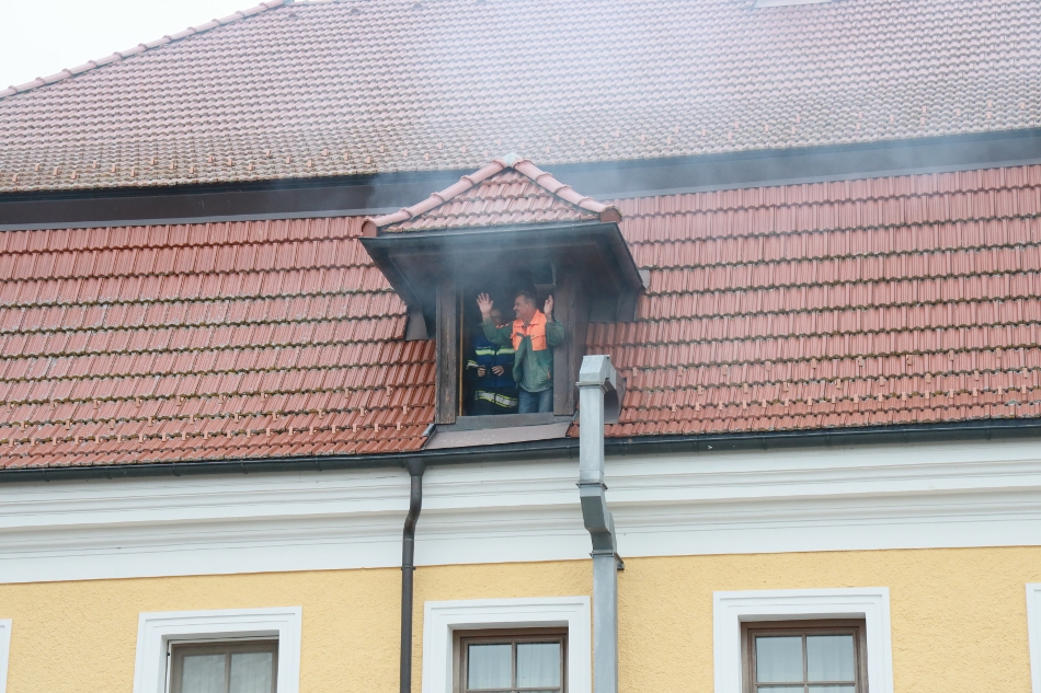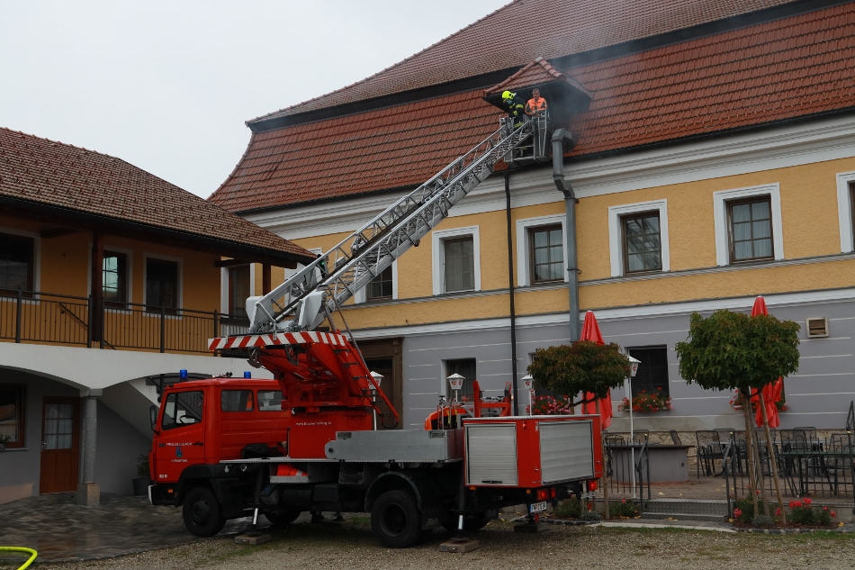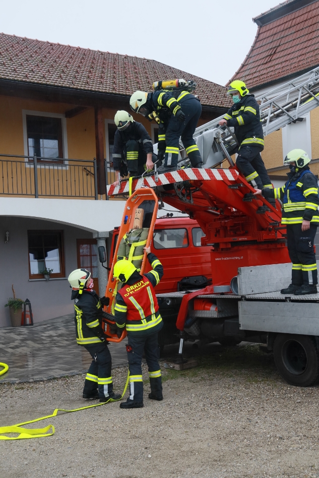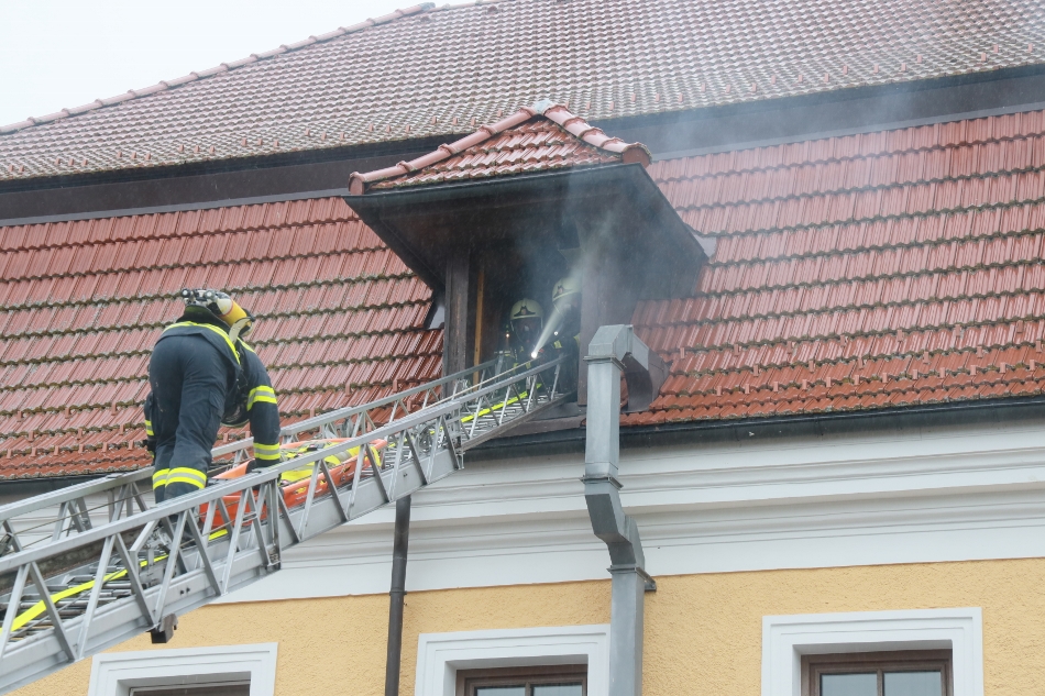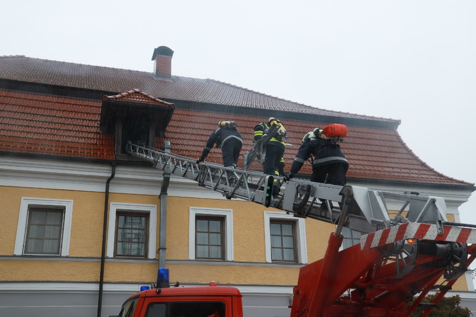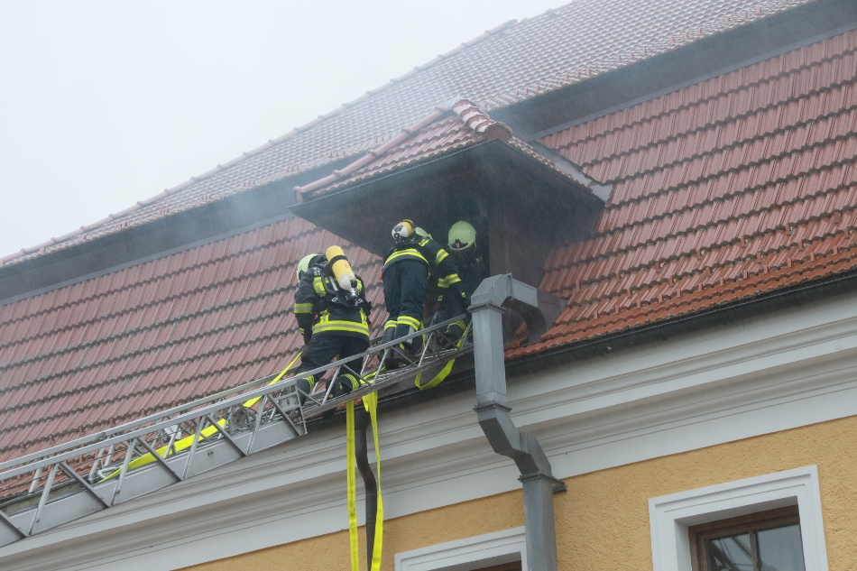 Die Atemschutztrupps übten den Löschangriff und die Rettung von verletzten Personen aus dem stark verrauchten Dachgeschoß.