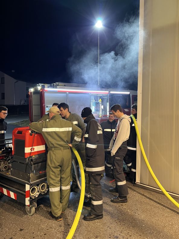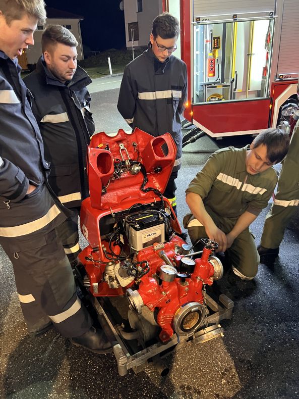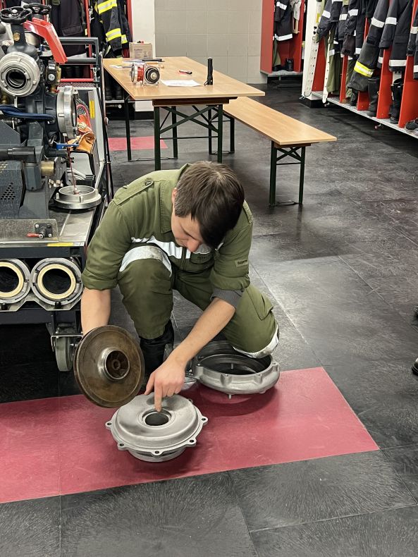 Nach einer theoretischen Einweisung in der Fahrzeughalle, wurde an beiden Tragkraftspritzen geübt.