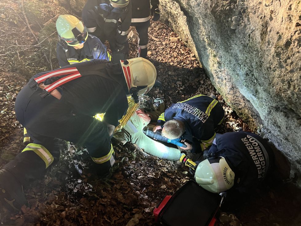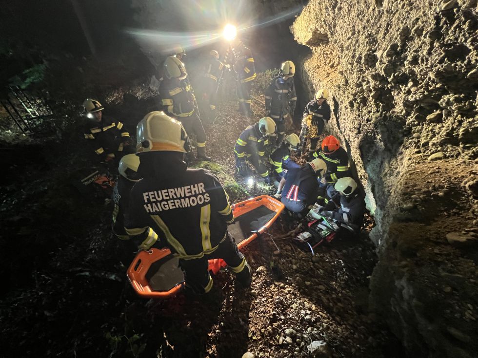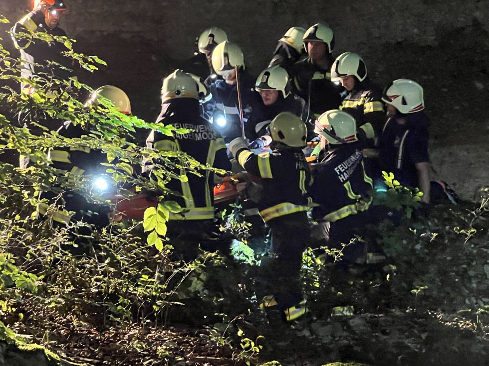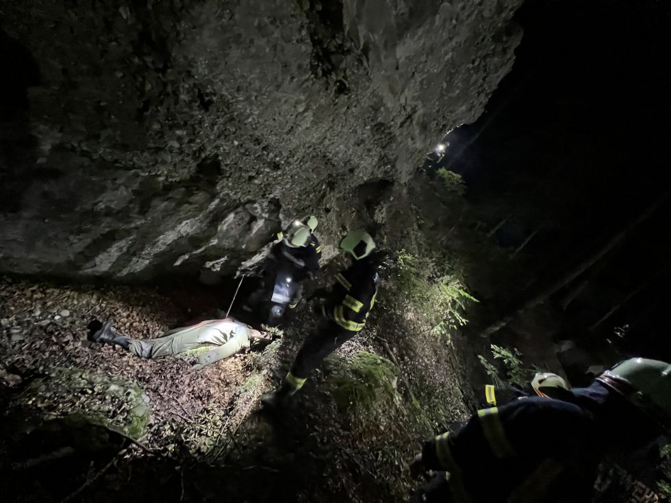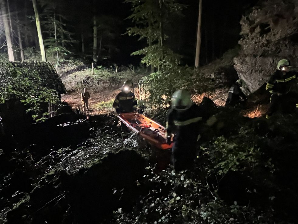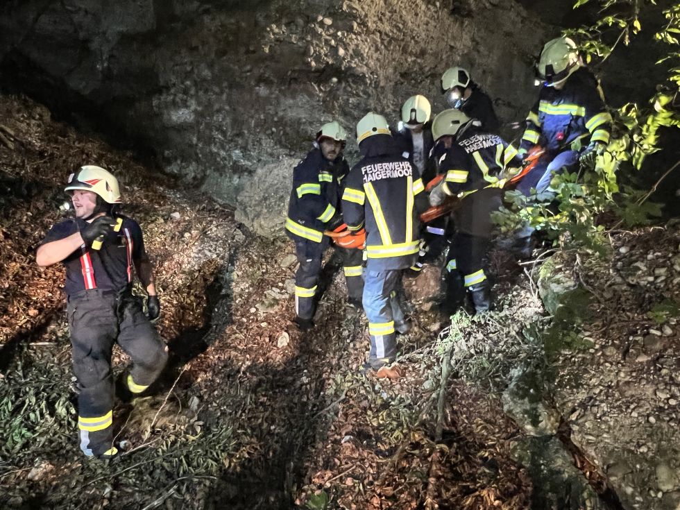 Die Rettung aus dem unwegsamen Gelände erfolgte mittels Schleifkorbtrage.