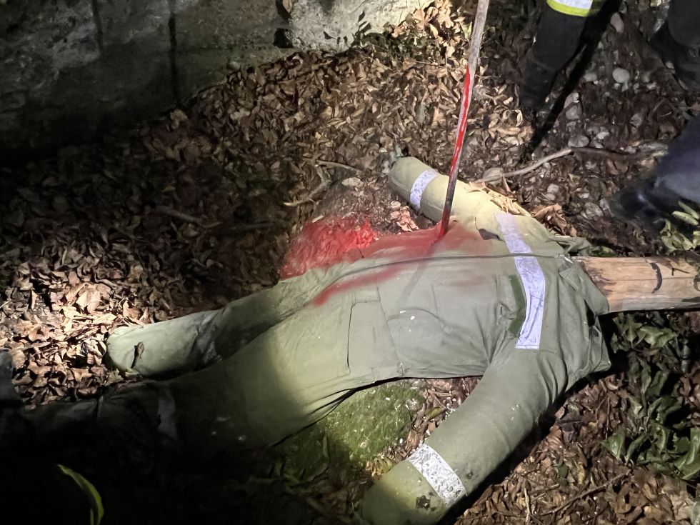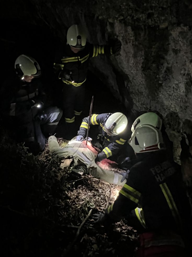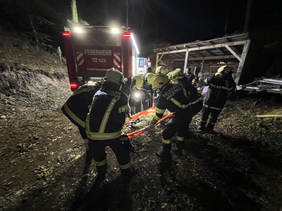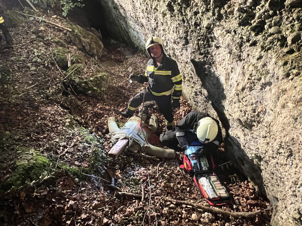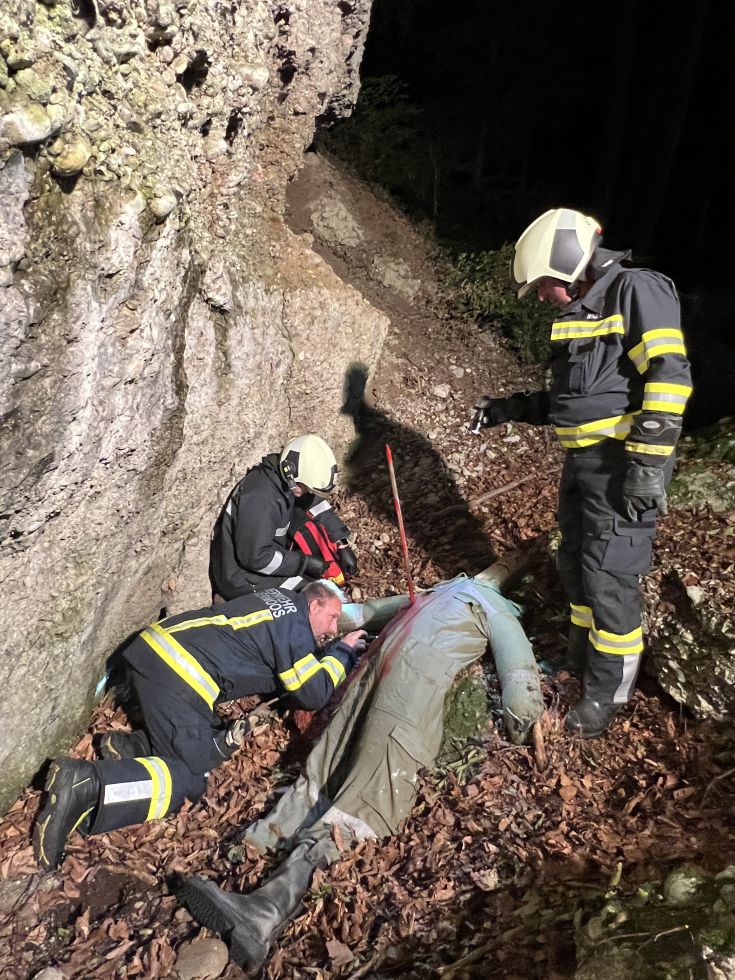 Nach kurzer Zeit konnte die vermisste Person lokalisiert werden. Sie war in unwegsames Gelände abgestürzt und hatte sich dabei eine Pfählungsverletzung durch eine Eisenstange zugezogen. Die Eisenstange wurde fixiert und die Person mit der Säbelsäge befreit.