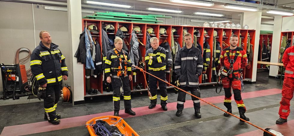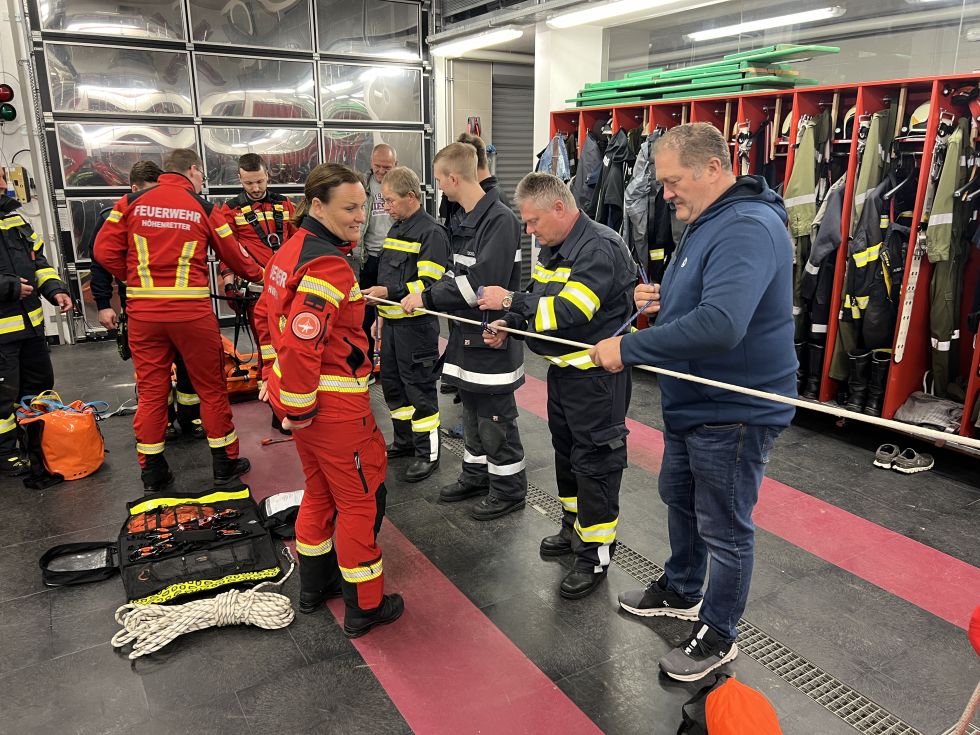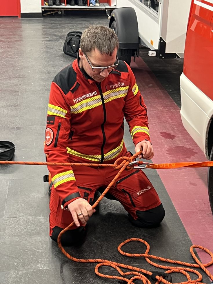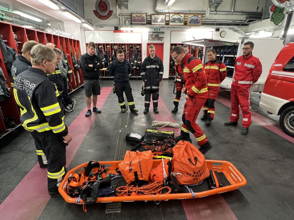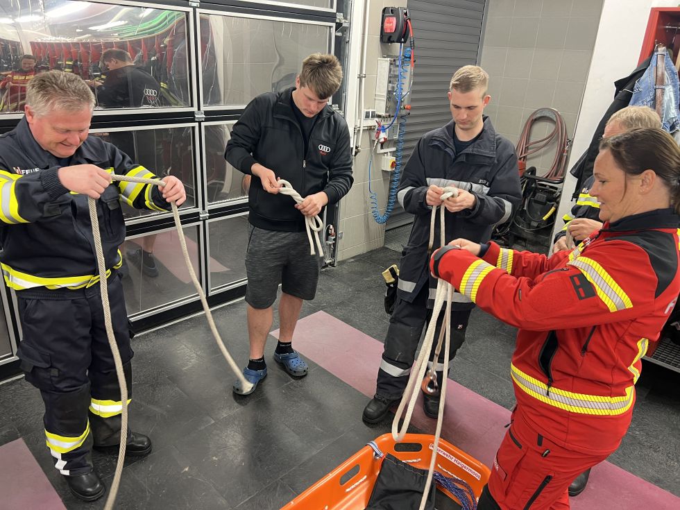 Im Anschluss wurden uns die wichtigsten Knoten beigebracht. Besonders der Aufbau einer Absturzsicherung fand das Interesse der Kameraden. Zum Abschluss besichtigten wir noch den gut ausgestatteten Anhänger des Stützpunktes. An der Übung nahmen 16 Kameraden teil.