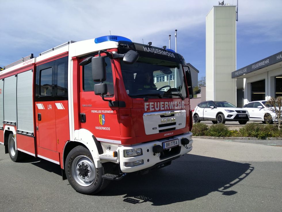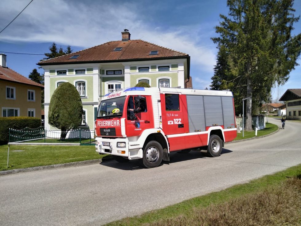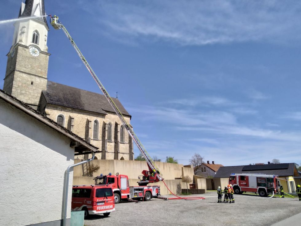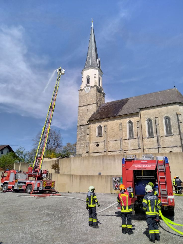 Für Samstag, 12.04.2025, plante die Feuerwehr Haigermoos eine Frühjahrsübung mit der Annahme der Dachstuhl der Kirche brennt. Dazu wurden die Tanklöschfahrzeuge aus den Feuerwehren Trimmelkam und Franking, sowie die Drehleiter aus Ostermiething nachalarmiert.