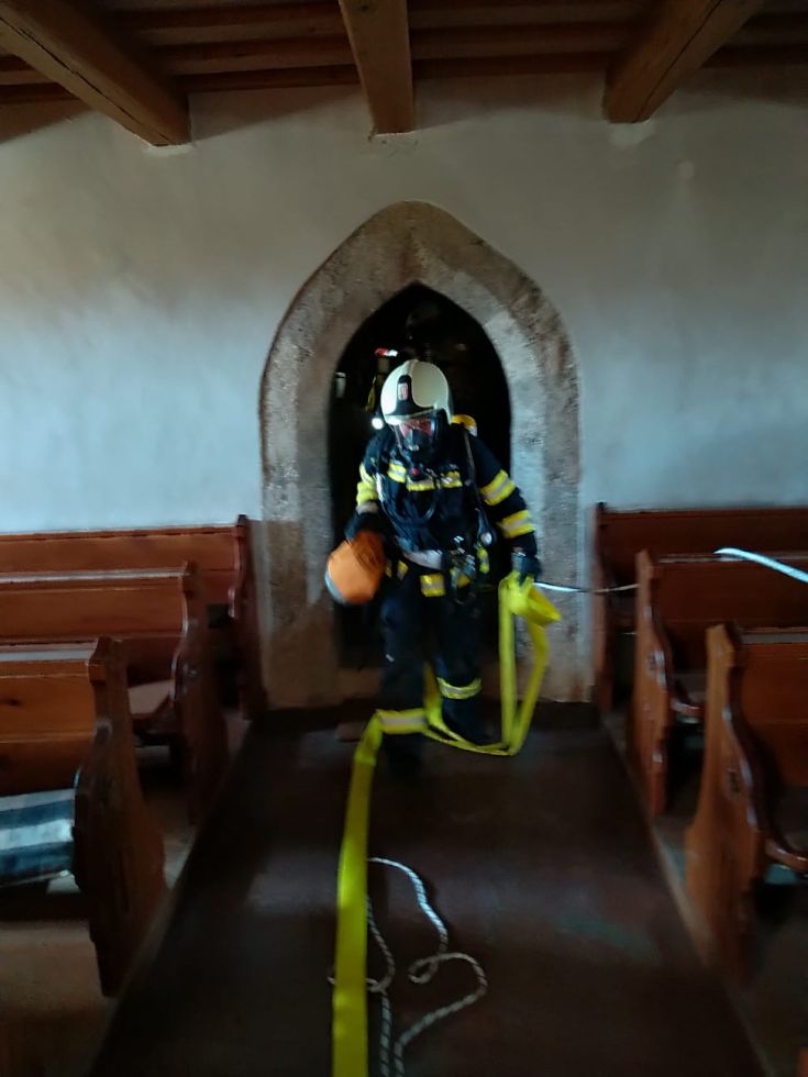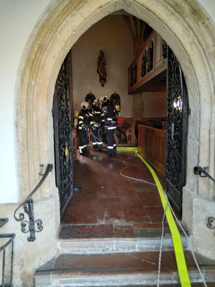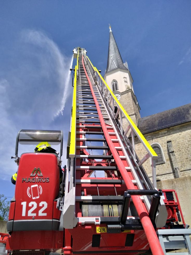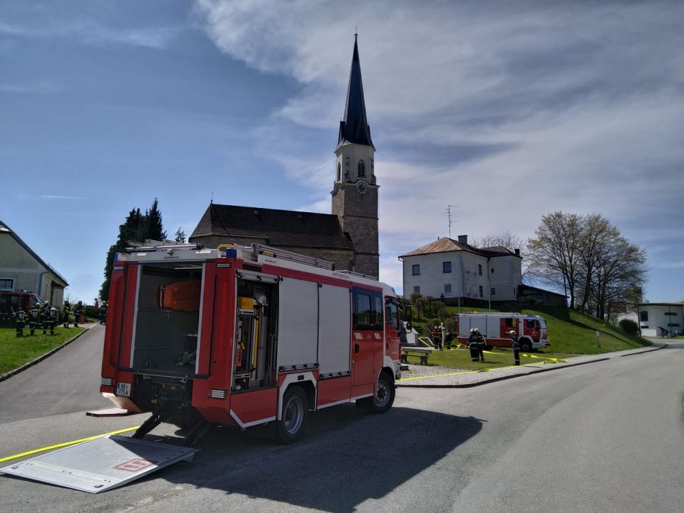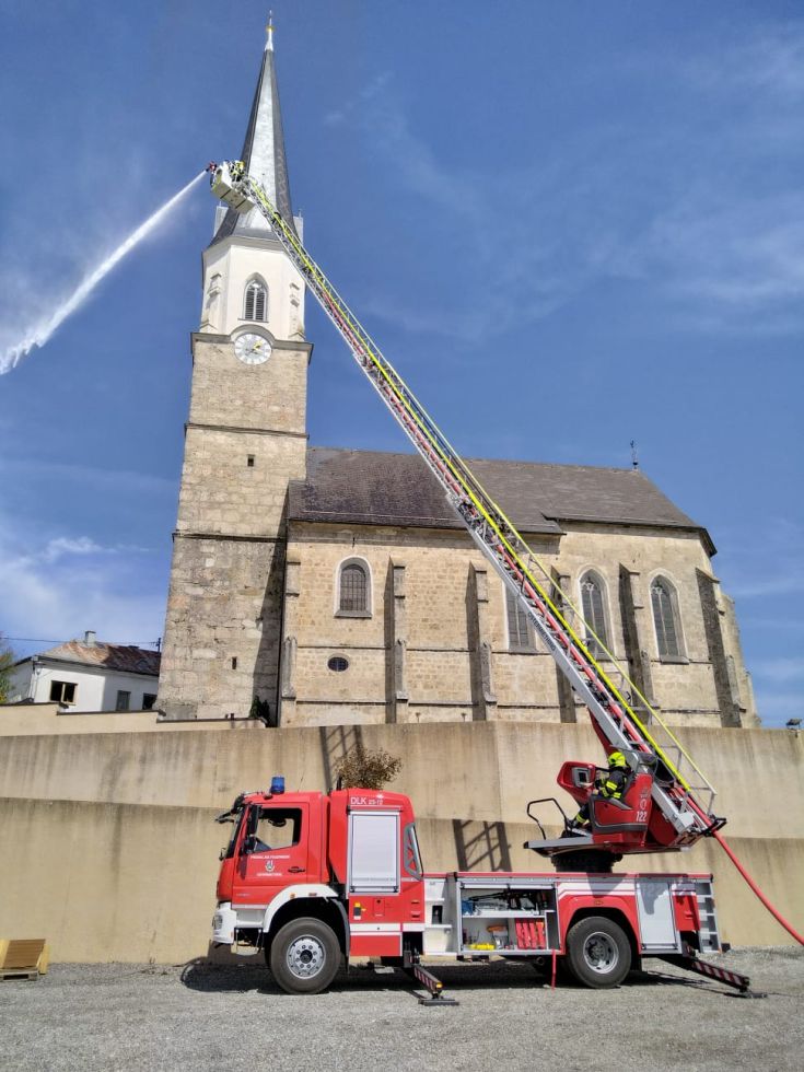 Für Samstag, 12.04.2025, plante die Feuerwehr Haigermoos eine Frühjahrsübung mit der Annahme der Dachstuhl der Kirche brennt. Dazu wurden die Tanklöschfahrzeuge aus den Feuerwehren Trimmelkam und Franking, sowie die Drehleiter aus Ostermiething nachalarmiert.